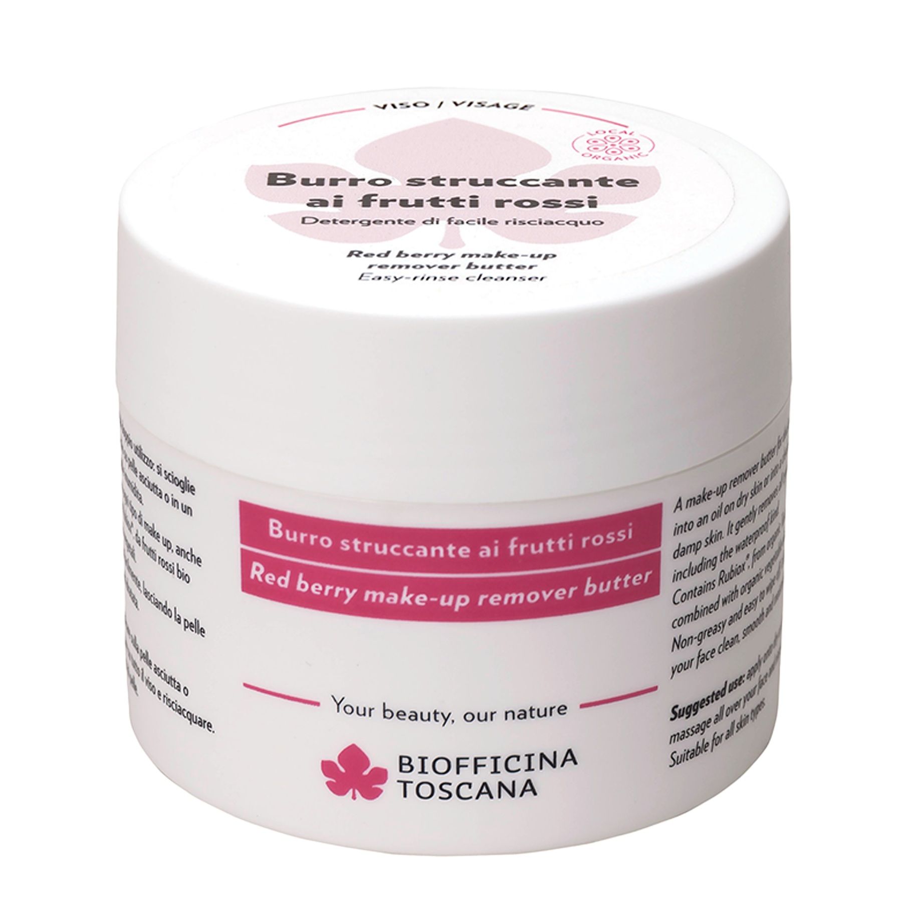 Formulato con Rubiox® — principio innovativo estratto da frutti rossi biologici toscani — e una miscela bilanciata di oli vegetali bio. Non unge, si risciacqua facilmente e lascia la pelle del viso pulita, liscia e idratata.