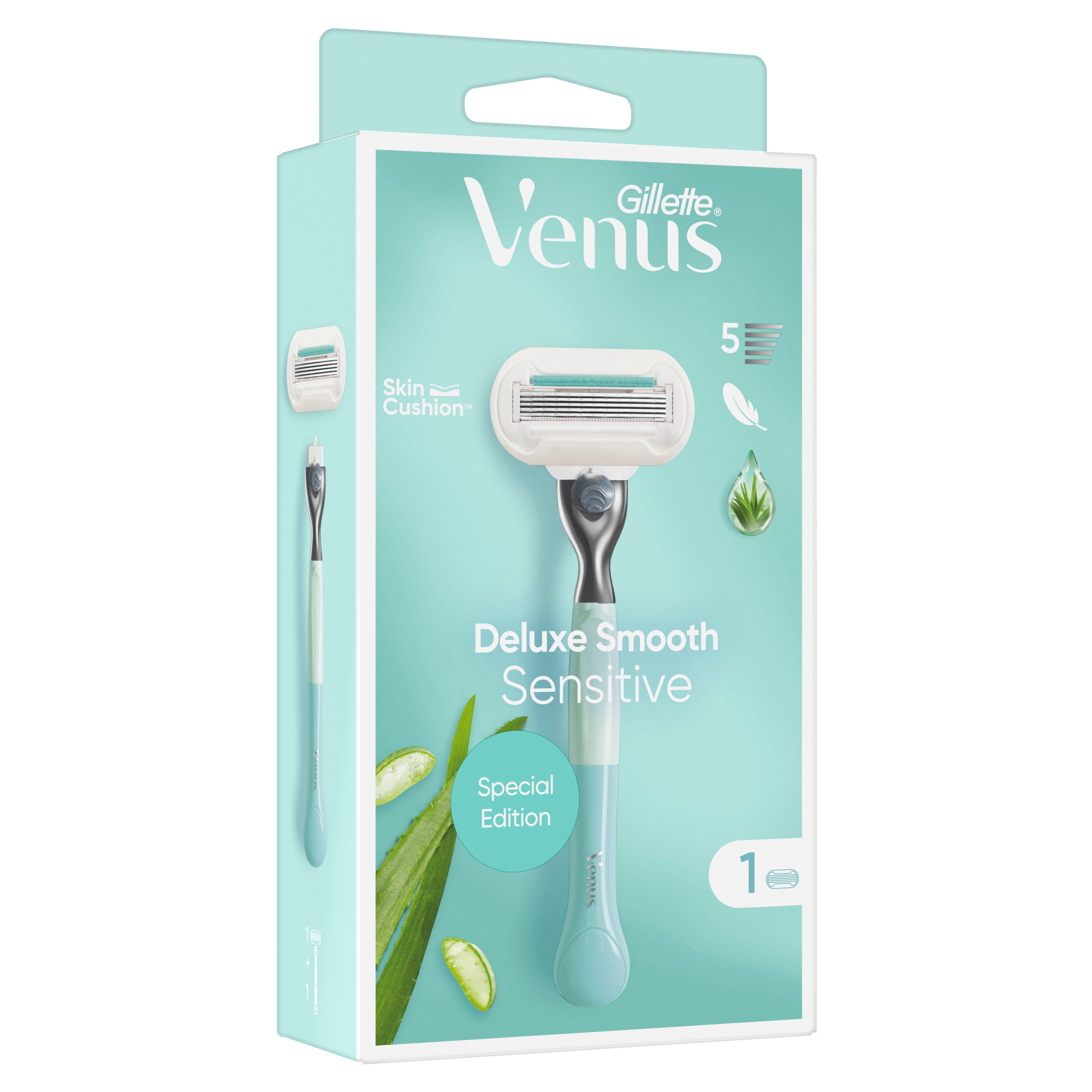 ​Venus V Editon Deluxe Smooth Sensitive Rasierer- 1 KlingeRobustes design: Diese Rasierklingen halten bis zu einen Monat (bei Verwendung zweimal die Woche), einfach verwenden und bei Bedarf ersetzenFünf Klingen mit diamantharter Beschichtung: Für eine sanfte und gründliche Rasurselbst bei empfindlicher Haut50 % mehr Schutz*: Die Venus SkinCushionTM Technologie hilftdie Haut bei jeder Rasur vor durch das Rasieren ausgelösten Hautirritationen zu schützen *nach 1 Monat verglichen mit der vorherigen Venus Gleitstreifen-TechnologieRobustes Klingendesign für längere Verwendbarkeit: Rasierklingen mit einem umlaufenden FeuchtigkeitsbandSkinElixir für einen besseren Gleiteffekt und einem Hauch von Aloe Vera. Die Ersatzklingen reichen bis zu 30 Tage* (*bei zwei Rasuren pro Woche)Ergonomisch und nachhaltig: Angenehme Griffigkeit dank Softgrip-Handstückzu 30 % gefertigt aus recyceltem KunststoffDer Griff bleibtes werden nur die Klingen ausgetauscht: Alle Venus Klingen passen auf alle Venus Handstücke (Außer Simply Venus und Venus für den Intimbereich)Vollständig recycelbare Verpackung: Vollständig recycelbarzu mindestens 40 % aus recyceltem Material hergestellt. FSC-zertifiziertGILLETTE VENUS DELUXE SMOOTH RASIER​
