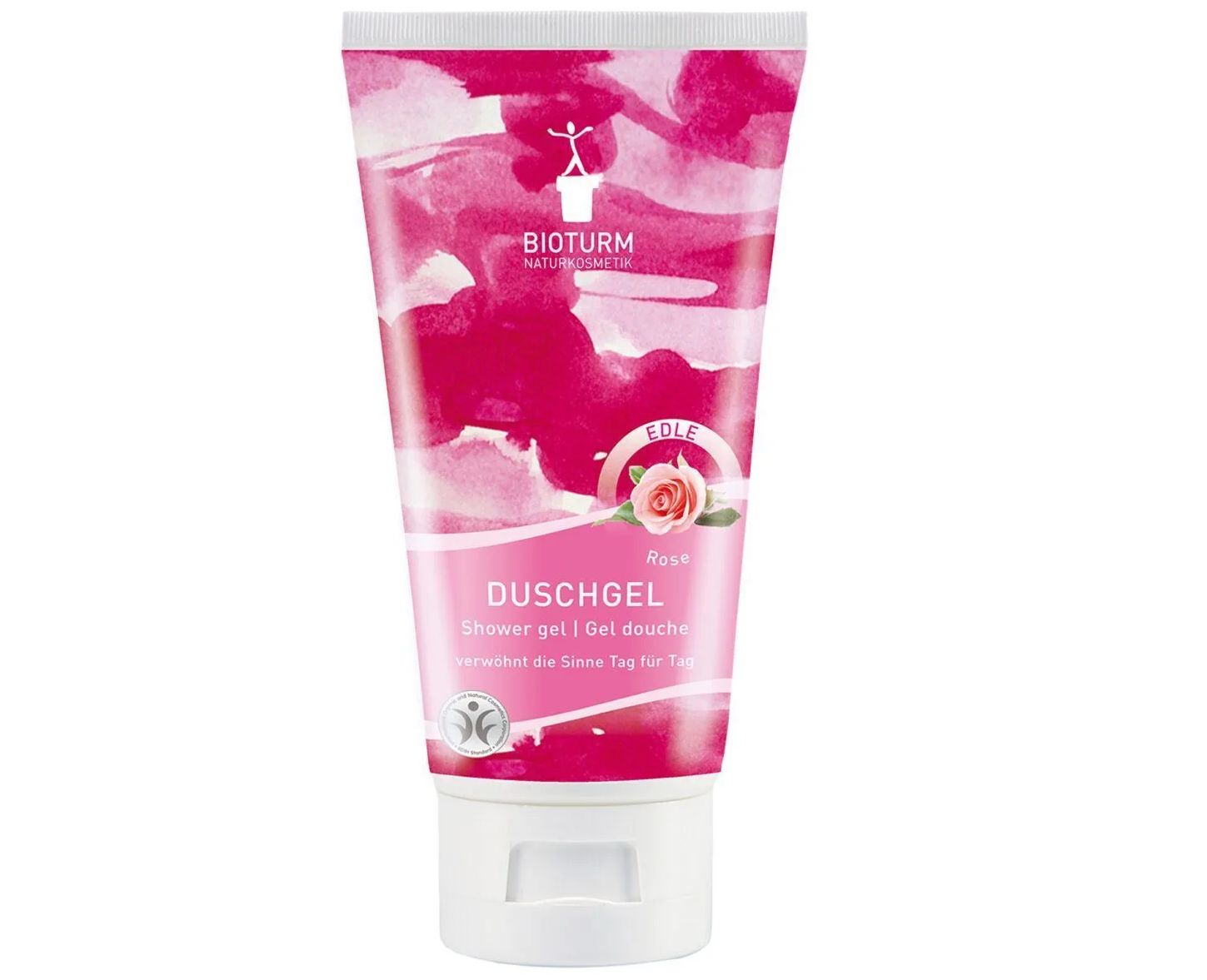 Il gel doccia alla rosa nobile di Bioturm deterge e profuma la pelle in modo particolarmente delicato.