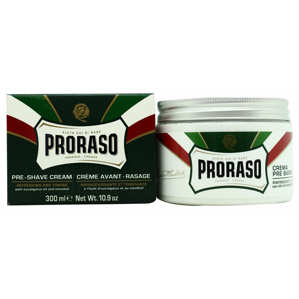 Crema da barba Proraso con estratto di eucalipto e glicerina, texture cremosa che ammorbidisce i peli. Protegge la pelle dalle irritazioni con effetto rinfrescante mentolo. Adatta a tutti i tipi di pelle. Formato da 300ml in tubo elegante. Rasatura confortevole e di qualità.