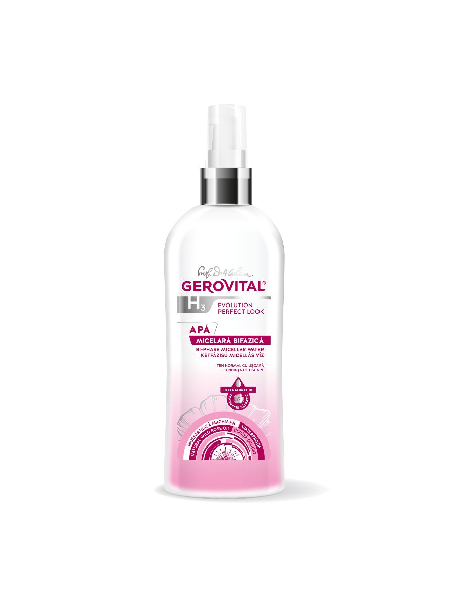 Gerovital Acqua Micellare Bifasica con Olio di Rosa Selvatica deterge delicatamente e in profondità la pelle del viso, del contorno occhi e delle labbra. Grazie alla sua formula bifasica e alle micelle attive, rimuove efficacemente anche il trucco waterproof senza irritare la pelle.