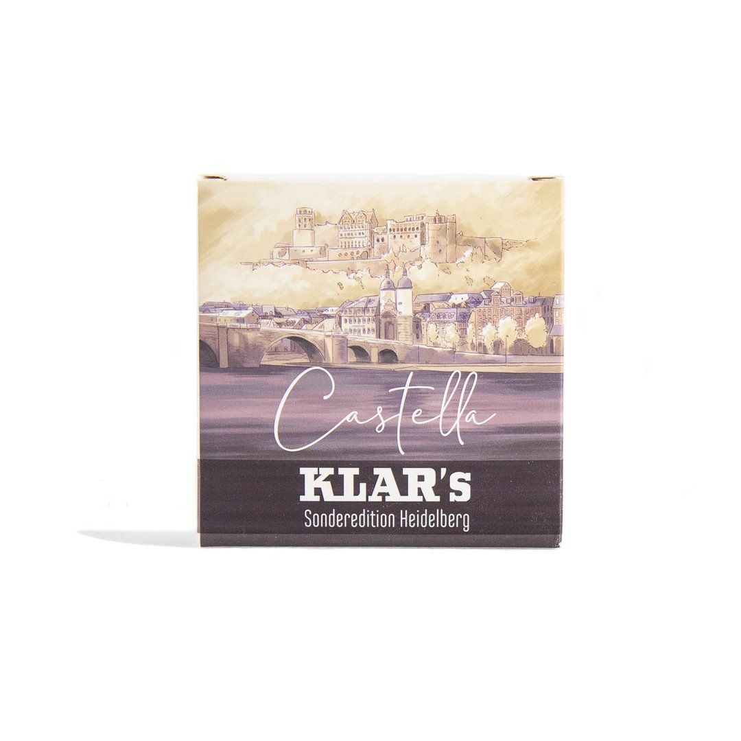 La storia della nostra fabbrica è strettamente legata a Heidelberg. Il profumo speziato e il rilievo artistico del castello di Heidelberg e del vecchio ponte ricordano la romantica città sul Neckar. Il sapone Castella di Klar è più di un prezioso oggetto da collezione. Oli puramente vegetali da coltivazione biologica controllata detergono delicatamente la pelle e portano un po' di nostalgia in bagno.