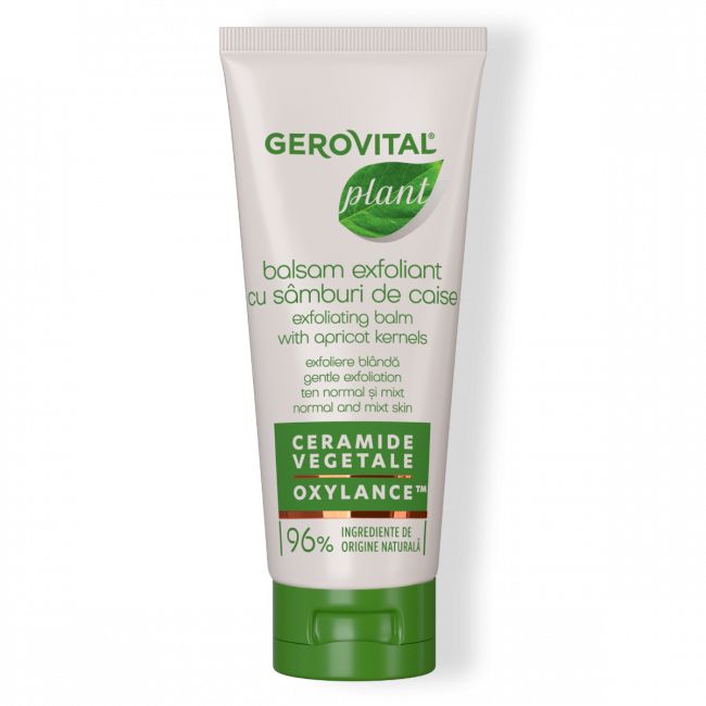 Balsamo Esfoliante Vegetale Gerovital con Noccioli di Albicocca, grazie al contenuto di Olio di Oliva, oli vegetali idrogenati e Ceramidi Vegetali, assicura una detersione ottimale e delicata, previene la disidratazione e dona morbidezza alla pelle. Le fini particelle esfolianti, ricavate dai noccioli di albicocca, rimuovono le cellule morte dalla superficie della pelle e consentono un delicato massaggio superficiale, che migliora la circolazione sanguigna e libera i pori dalle impurità. Contiene il 96% di ingredienti di origine naturale, il restante 4% degli ingredienti assicura una buona conservazione della formula.