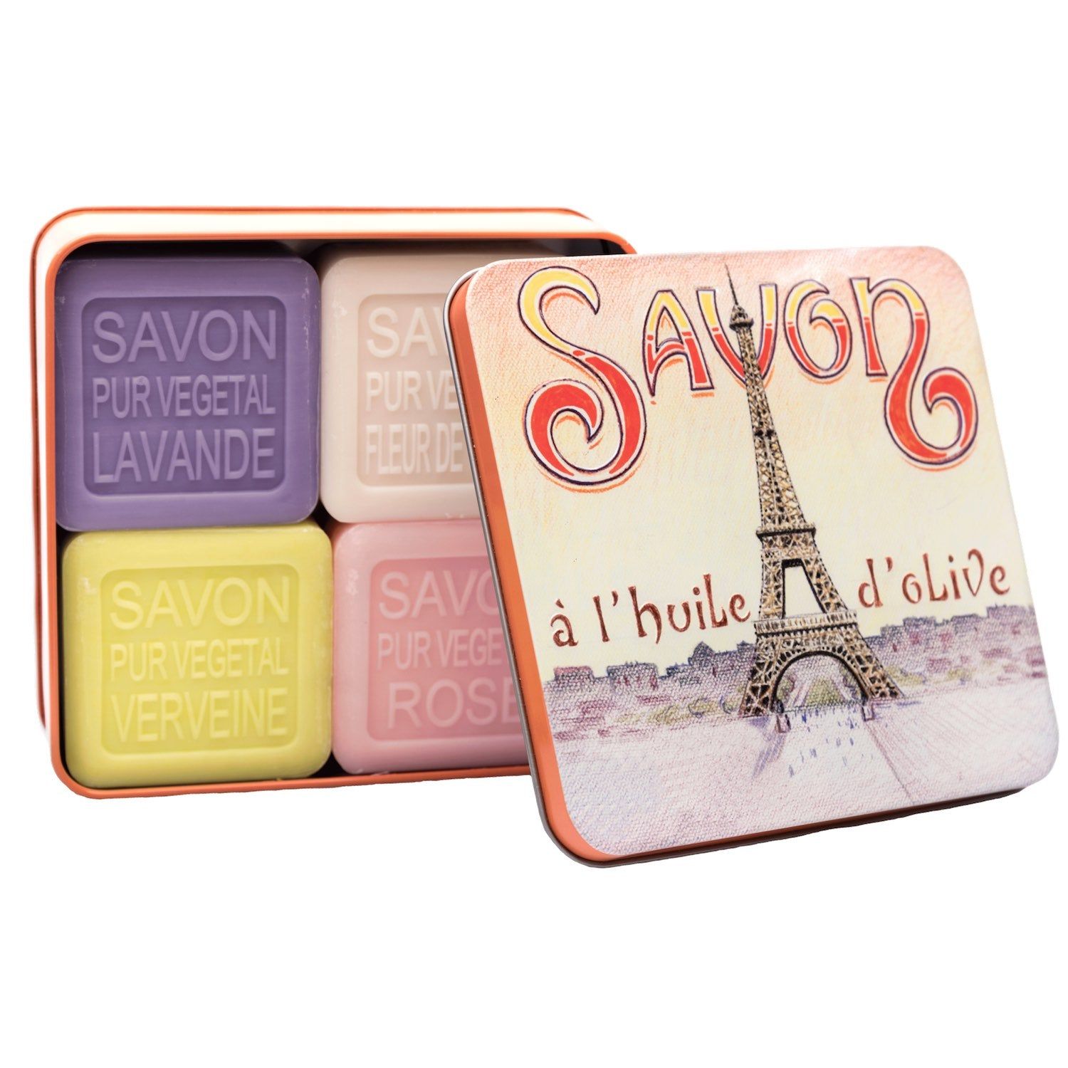 Questi 4 saponi da 100 g vengono consegnati in una scatola di metallo e profumano meravigliosamente dei nostri quattro profumi più popolari. Questa scatola di metallo in stile retrò è stata illustrata dal pittore Luc MAZAN, rendendola un oggetto decorativo nella vostra casa.