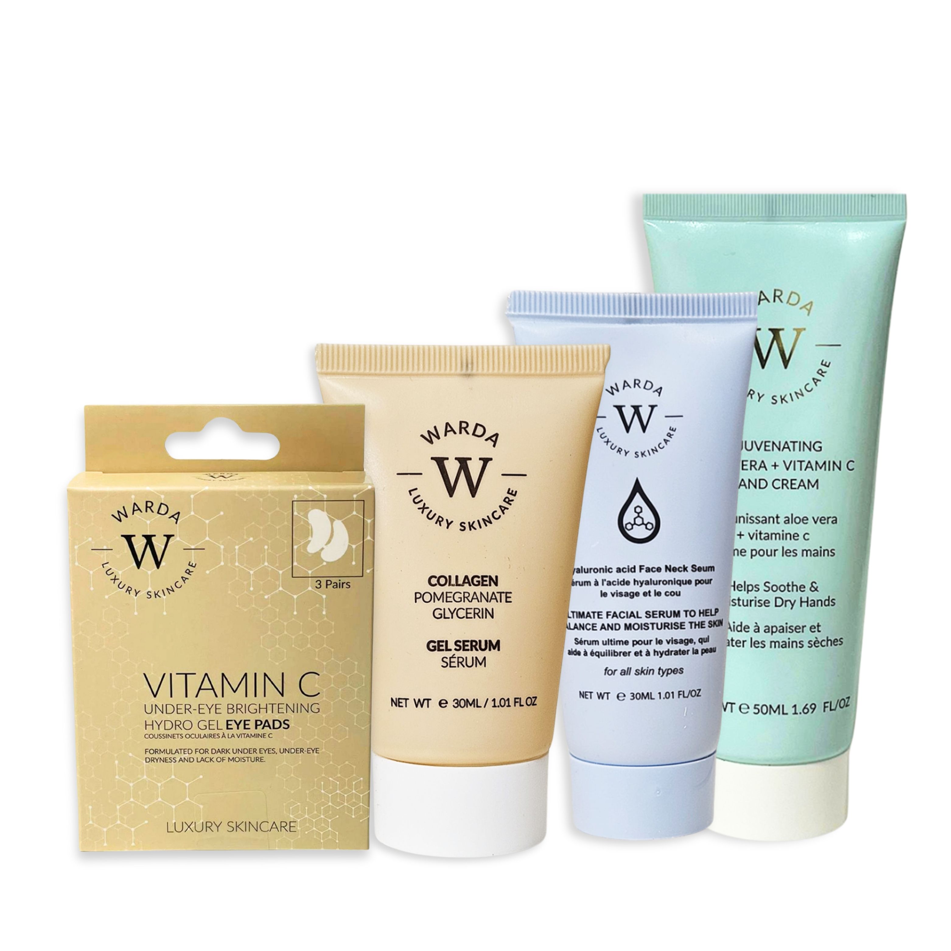 Gel idroelettrico illuminante alla vitamina C sotto gli occhi rinfresca e rivitalizza la delicata zona sotto gli occhi con questi potenti cerotti idrogel. Arricchiti con vitamina C, agiscono su occhiaie, gonfiori e linee sottili, lasciando la pelle più luminosa e giovane. Siero viso e collo all'acido ialuronico disseta la tua pelle con questo siero idratante. L'acido ialuronico penetra in profondità nella pelle, trattenendo l'idratazione e riempiendo le linee sottili per un colorito più liscio e radioso. Crema mani ringiovanente all'aloe vera + vitamina C nutre e protegge le tue mani con questa crema mani lenitiva. Arricchita con aloe vera e vitamina C, idrata in profondità, ripara e illumina, lasciando le tue mani morbide, elastiche e giovani.