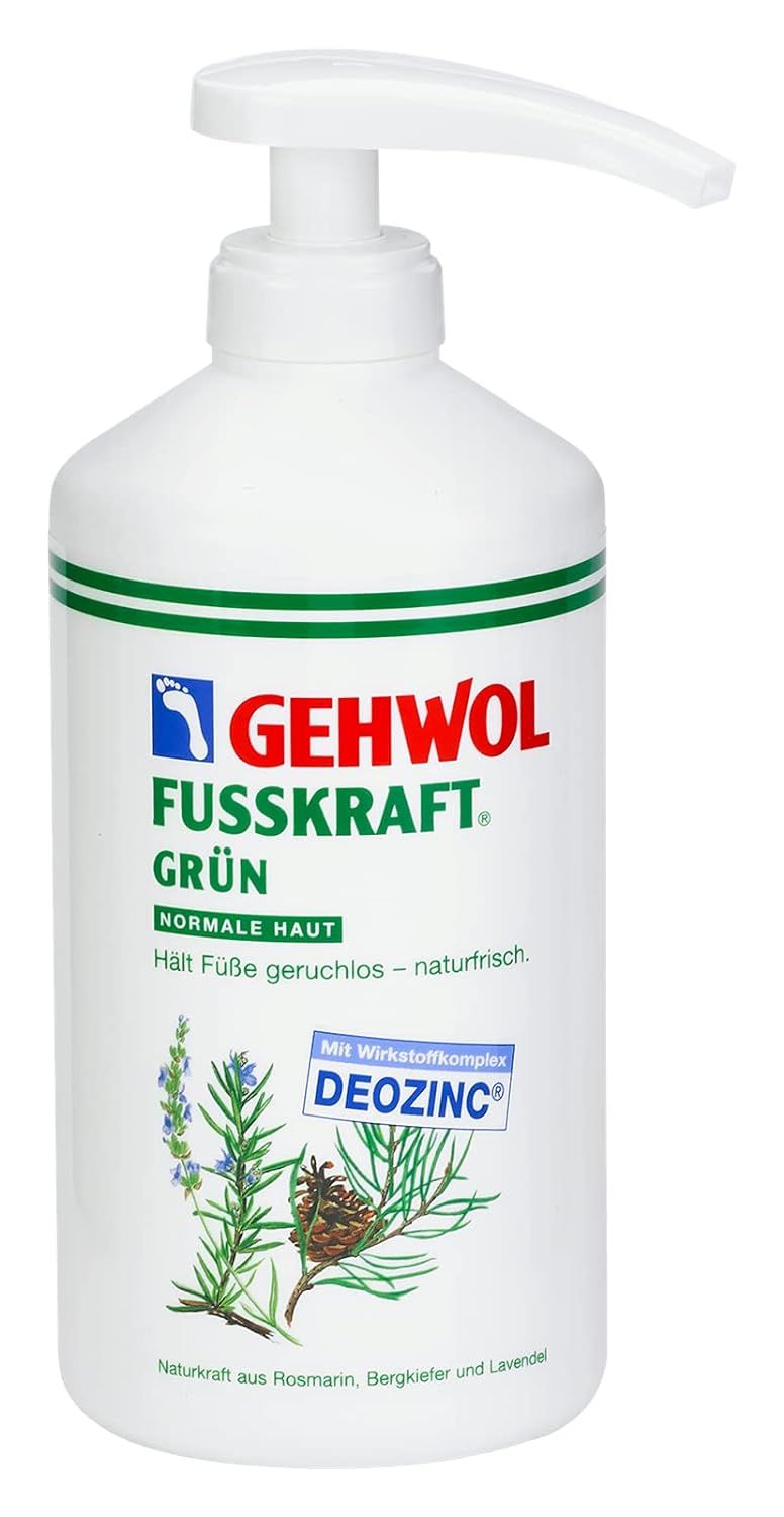 GEHWOL FUSSKRAFT GREEN 500 ml PELLE NORMALE Mantiene i piedi inodori - naturalmente freschi GEHWOL FUSSKRAFT GREEN contiene il complesso di principi attivi Deozinc in una base di crema nutriente a rapido assorbimento con burro di karité, olio di jojoba e aloe vera per una protezione di lunga durata contro l'odore dei piedi. La sudorazione è normalizzata. I piedi diventano freschi, inodori, lisci ed elastici. I comprovati principi attivi disinfettanti prevengono il piede d'atleta, il prurito e le vesciche tra le dita. Oli essenziali naturali, canfora rivitalizzante e mentolo rinfrescante leniscono il bruciore e il dolore ai piedi. Dermatologicamente testato Adatto anche ai diabetici Contenuto: barattolo da 500 ml con dispenser
