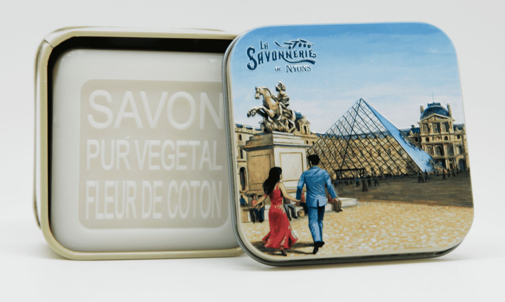 Questo sapone da 100 g viene fornito in una scatola di metallo della serie "Le Louvre" e profuma meravigliosamente di fiori di cotone. Questa scatola di metallo in stile retrò con il motivo "La Pyramide" è stata illustrata da Luc Mazan, artista regionale di Nyons, rendendola un oggetto decorativo nella vostra casa.