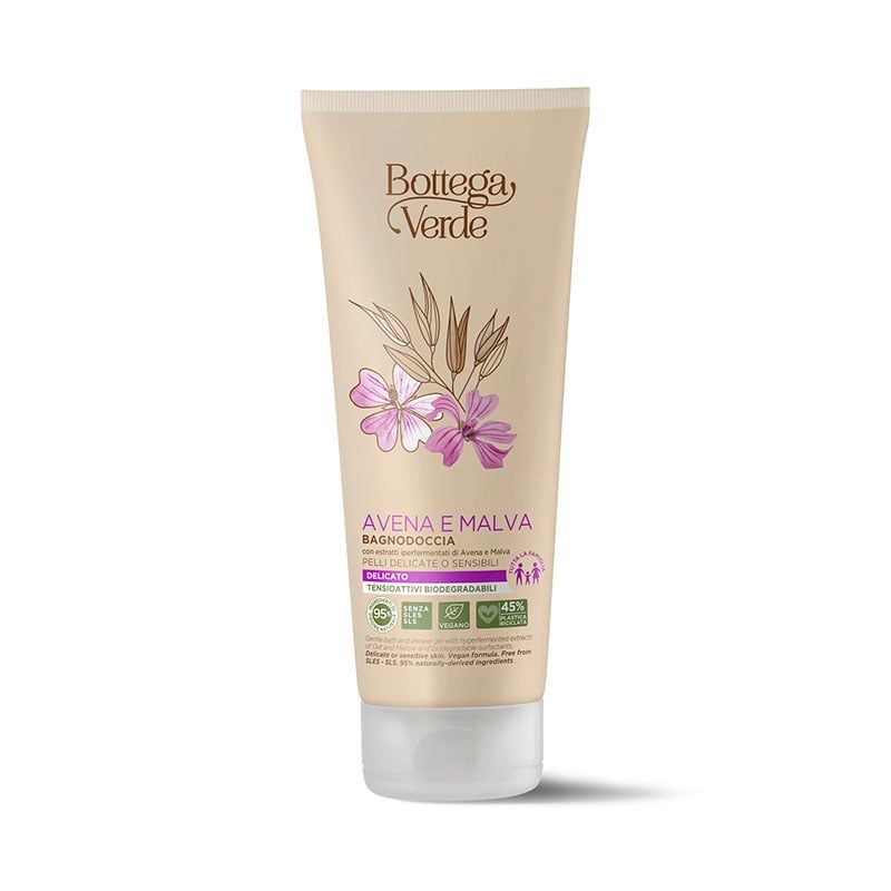 Dolce delicato benessere con questo profumato bagnodoccia ideale per la detersione di tutta la famiglia, anche dei più piccoli. Contiene estratti iperfermentati di Avena e Malva della Tenuta Bottega Verde dall'azione lenitiva e addolcente potenziata.