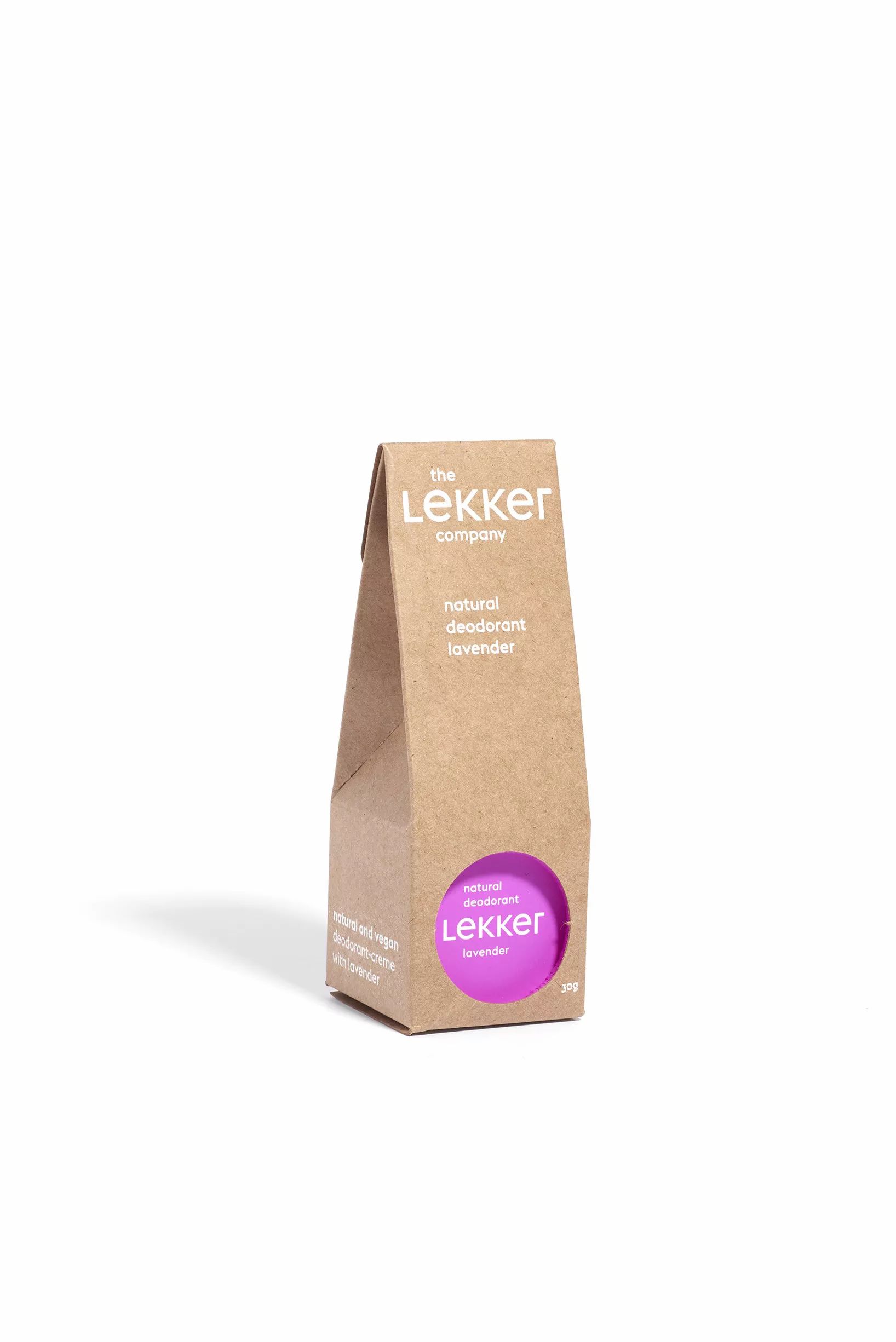 deodorante in crema dell'azienda lekker con crema deodorante alla lavanda a base di bicarbonato di sodio, olio di cocco e burro di karitè. Previene gli odori senza ostruire i pori. 100% vegetale e ovviamente non testato sugli animali. 100% naturale e di origine vegetale Profumo floreale di lavanda francese Non lascia macchie Adatto a vegani e vegetariani Applicazione: applicare una quantità pari a un pisello su ciascuna ascella al mattino e avere un buon profumo tutto il giorno. È meglio non indossare indumenti sintetici per ottenere l'effetto migliore. Conservare a temperatura ambiente.