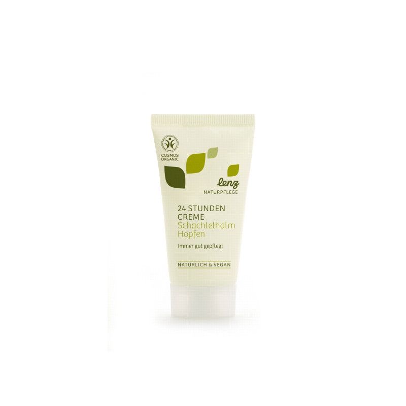 La crema 24 ore è adatta come crema da giorno o da notte. Idrata la pelle e la riporta in equilibrio. La crema 24 ore è naturale e puramente vegana. Il fiore di luppolo proviene da coltivazione biologica tedesca. Tutti i prodotti Lenz sono certificati secondo gli standard BDIH. Contenuto, INCI Aqua, Hordeum Vulgare Stem Water*, Helianthus Annuus Seed Oil*, Glycine Soja Oil*, Glyceryl Stearate, Glicerina, Butyrospermum Parkii Butter*, Cetearyl Alcohol, Isoamyl Laurate, Theobroma Cacao Seed Butter*, Equisetum Arvense Extract*, Humulus Estratto di lupulus*, fosfato di diamido, olio di Prunus Amygdalus Dulcis*, olio di semi di Vitis Vinifera*, tocoferolo, palmitato di ascorbile, acido deidroacetico, lecitina, acido citrico, gomma di xantano, benzoato di sodio, sorbato di potassio, profumo, alcool benzilico, limonene, linalolo. *da coltivazione biologica controllata