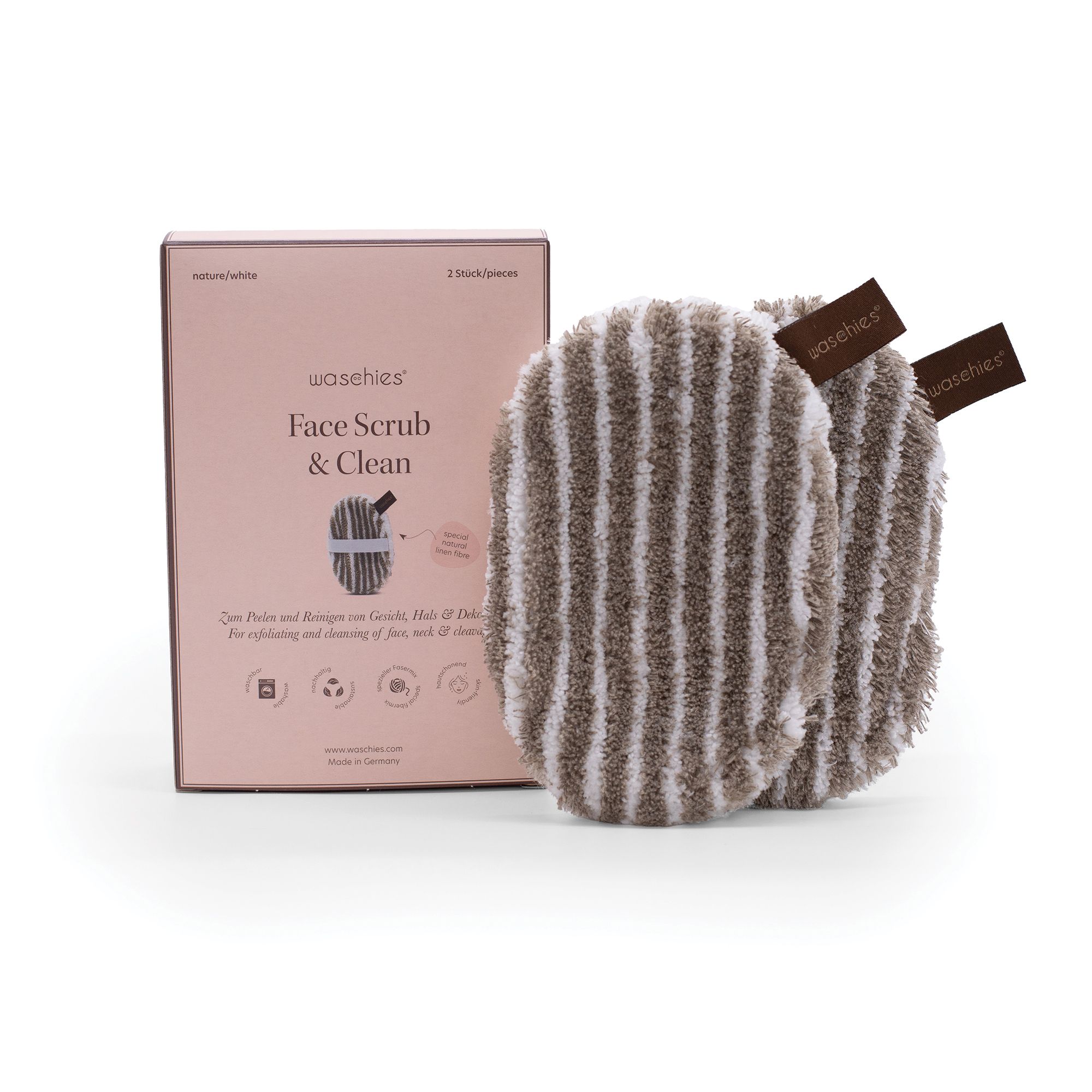 Pad per peeling Scrub & Clean Peeling delicato con sola acqua! Il nostro waschies Scrub Clean ha due lati di applicazione: Il lato in lino naturale esfolia delicatamente la pelle grazie alla sua consistenza ruvida. Il lato morbido, realizzato con un mix di microfibre e fibre di viscosa, rimuove le cellule morte e pulisce in profondità i pori. \Prodotto in Franconia, Germania. \nMateriale: lato esfoliante 100% fibra di lino; lato detergente 88% poliestere/ 12% viscosa Cura: lavabile fino a 60° C senza ammorbidente. Adatto all'asciugatura in asciugatrice. Dimensioni: 10,5 cm x 15,5 cm Consegna: 2x cuscinetti esfolianti waschies con elastico