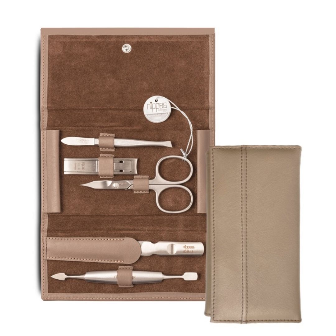 Il set è racchiuso in una custodia pieghevole in pelle di alta qualità nel colore tortora. La tenuta sicura è garantita dalla pratica chiusura a scatto.