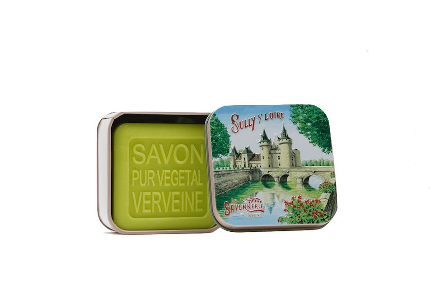 Questo sapone da 100 g viene consegnato nella scatola di metallo della serie "Chateaux de la Loire" e profuma meravigliosamente di verbena. Questa scatola di metallo in stile retrò con il motivo "Sully sur Loire" è stata illustrata da Luc Mazan, artista regionale di Nyons, rendendola un oggetto decorativo nella vostra casa.