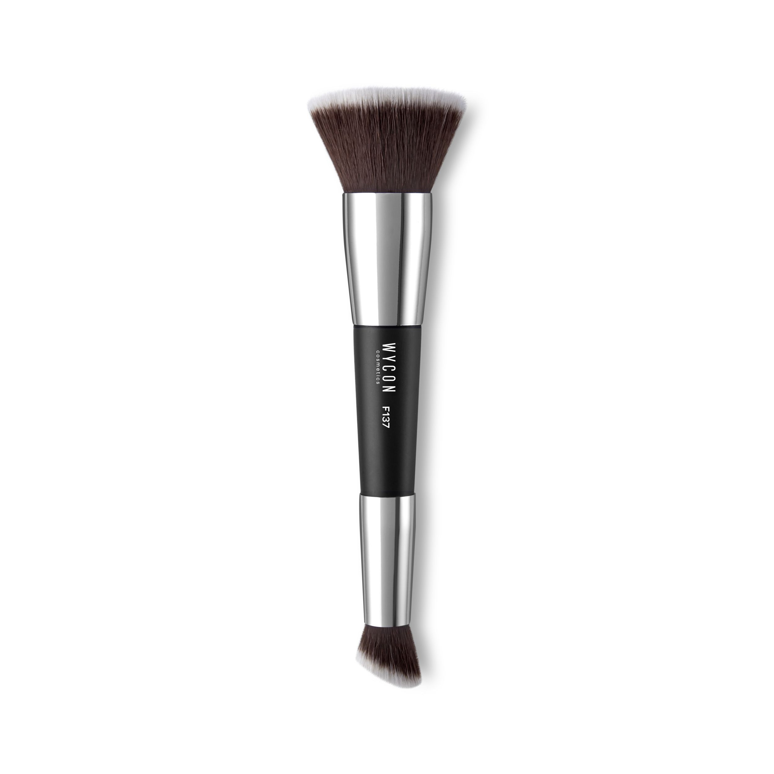 Prelevare il fondotinta con la parte grande e picchiettare sul viso, mentre con la parte più piccola stendere il correttore per illuminare e delineare i volumi del viso.