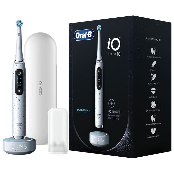 Oral-B iO Series 10. Utilizzo: Adulto, Tipo di spazzolino da denti: Spazzolino rotante-oscillante, Modalità dello spazzolino: Cura quotidiana, Pulito profondo, Cura gum, Sensibile, Sbiancante. Alimentazione: Batteria, Tipo batteria: Batteria integrata, Tempo di ricarica: 3 h. Tipo di imballo: Scatola. Numero di spazzolini inclusi: 1 pz, Numero di testine incluse: 1 pz. Certificati di conformità: CE