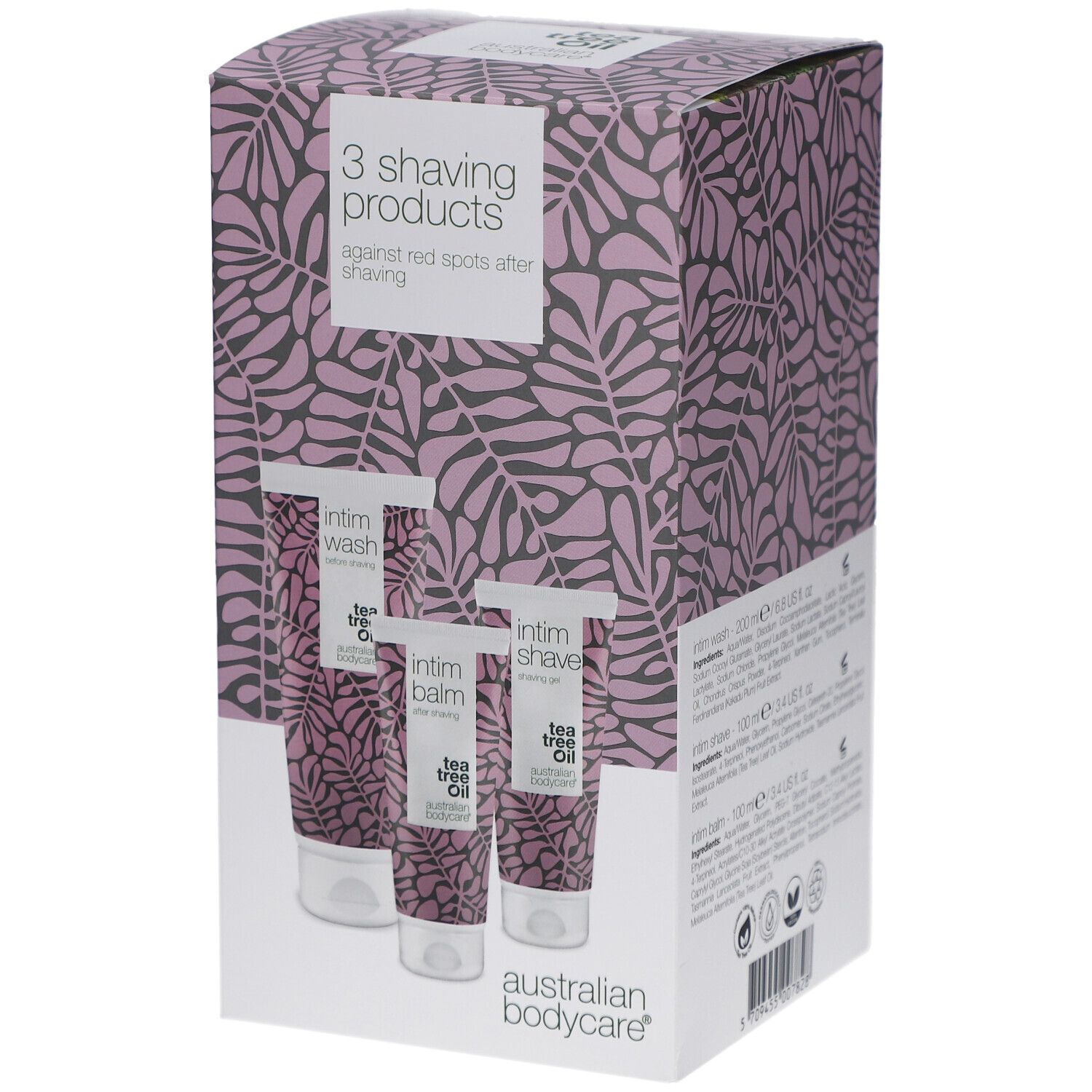 Il set per la rasatura intima include Intim Wash, Intim Shave e Intim Balm con olio di albero del tè, che agiscono efficacemente contro i batteri e garantiscono una rasatura delicata e liscia, libera da brufoli e peli incarniti.