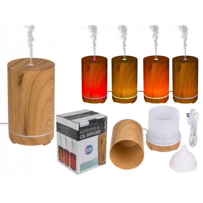 Umidificatore/Diffusore di olio, Ottica Torre in legno, con LED e cavo USB