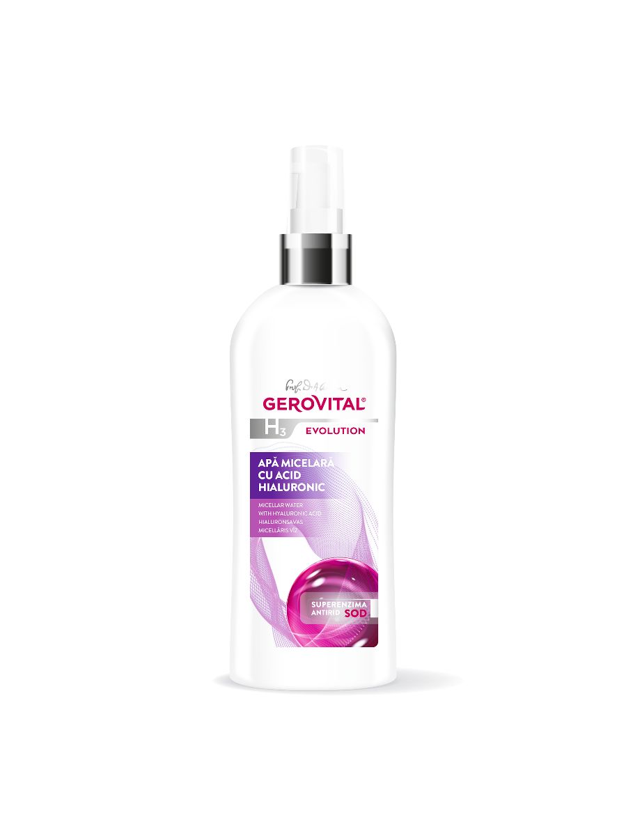L'acqua micellare dell'acido ialuronico Gerovital H3 Evolution deterge delicatamente viso, occhi e labbra.