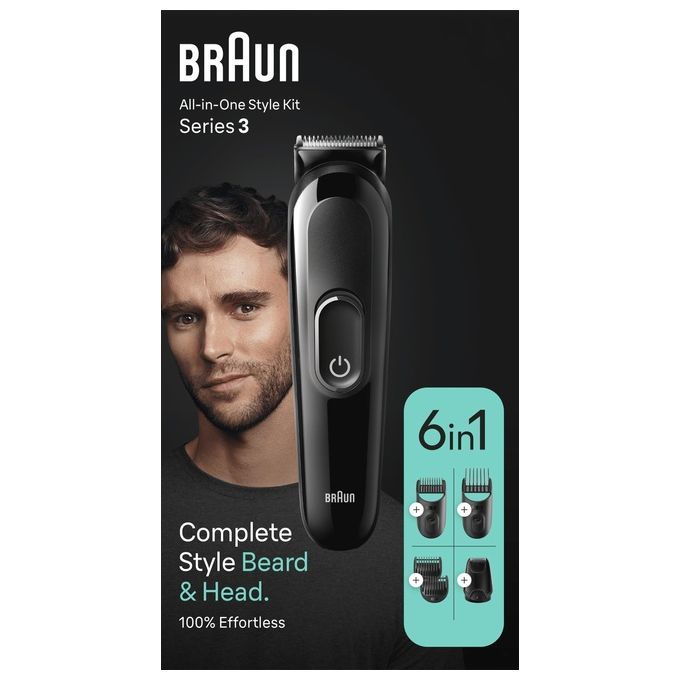 Rasatura da viso e barba, alla testa grazie all’utilizzo del Kit per lo styling tutto-in-uno Braun Series 3. Kit per la rasatura 6-in-1 realizzato per barba, capelli, dettagli e molto altro. Con lame ultra affilate e autonomia di 50 minuti.