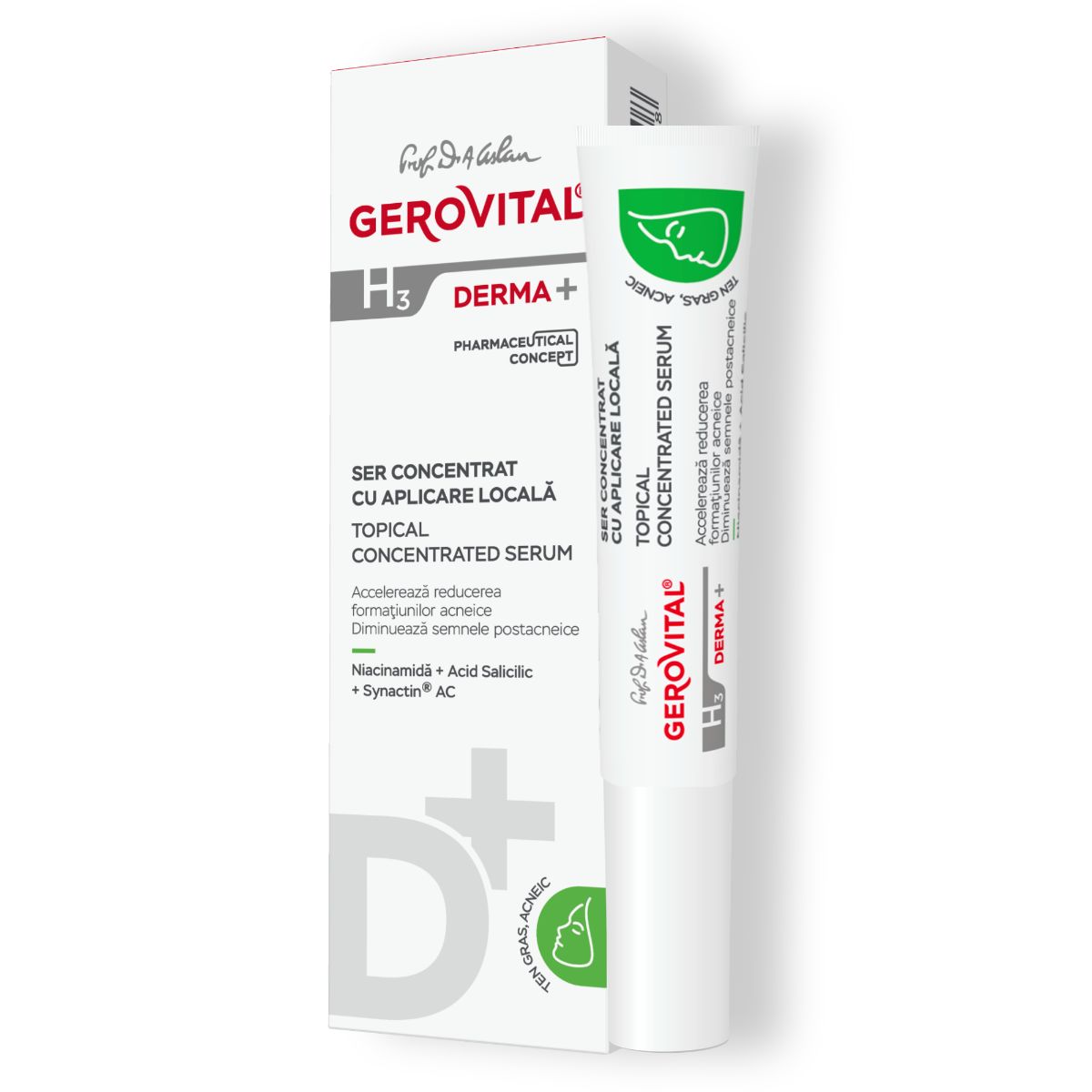 Gerovital H3 Derma+ Concentrated Topical Serum un prodotto studiato per ridurre le macchie acneiche e le cicatrici post-acneiche. Si applica rigorosamente localmente, sulle aree colpite dall'acne (comedoni, papule, pustole), soprattutto in caso di acne giovanile lieve e media, e nei casi gravi si consiglia l'associazione di terapia interna, sotto controllo medico specializzato.