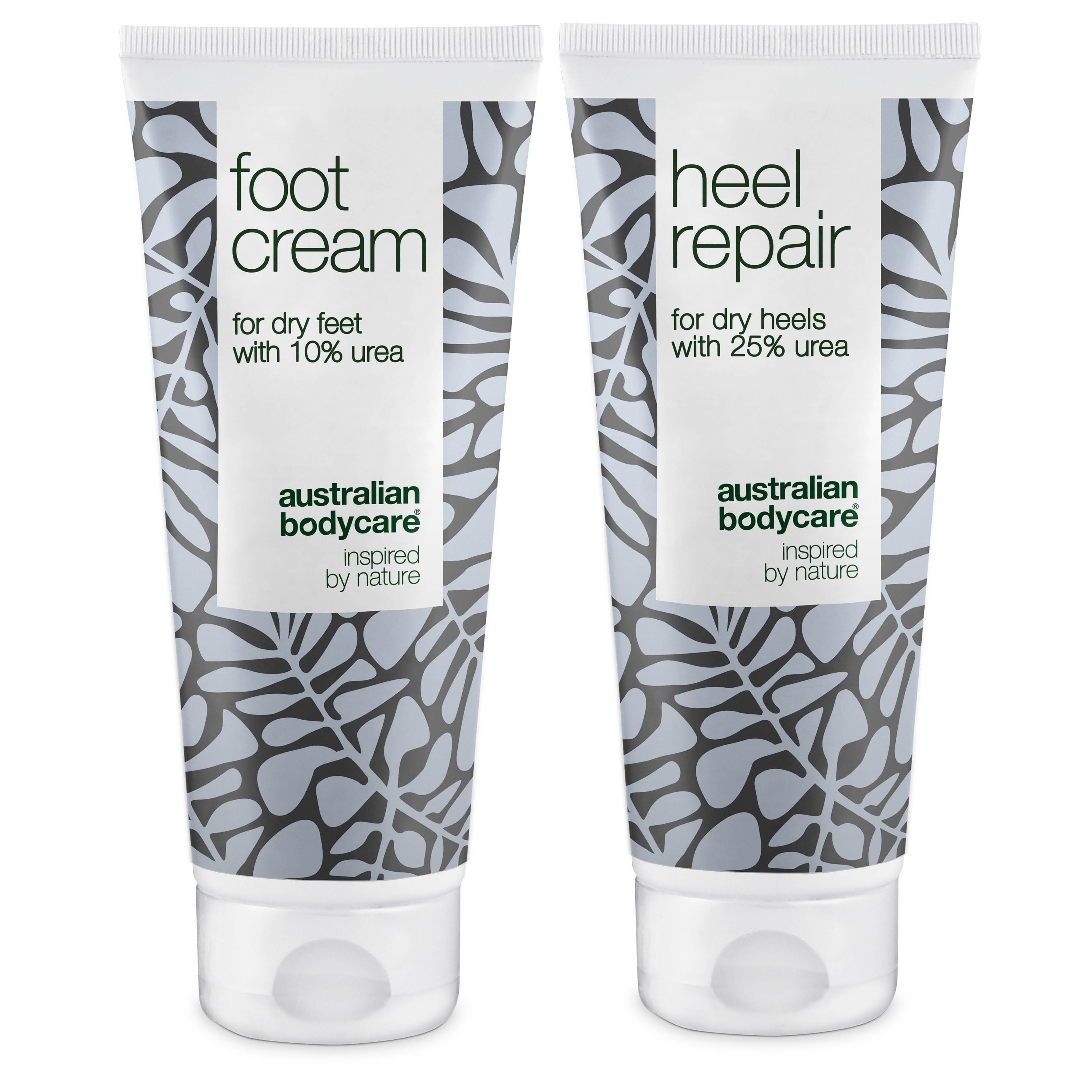 Sbarazzati dei piedi secchi e dei calli con i due prodotti emollienti e idratanti. La crema per i piedi e la crema per i talloni sono a base di olio dell'albero del tè e urea/carbamide naturale.