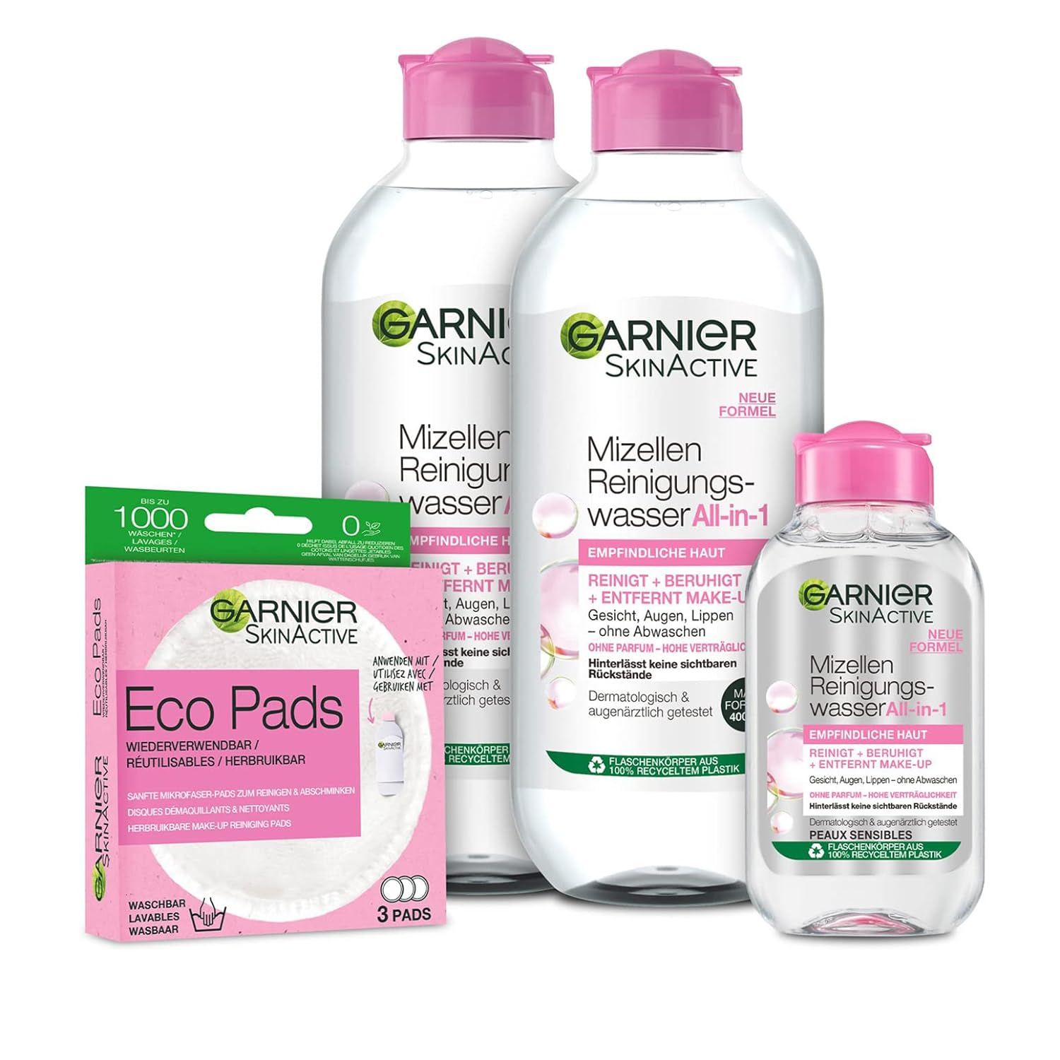 Contenuto della fornitura: set per la pulizia del viso micellare SkinActive con 2 x 400 ml di acqua micellare, 1 x mini acqua micellare e 3 confezioni di eco-tamponi