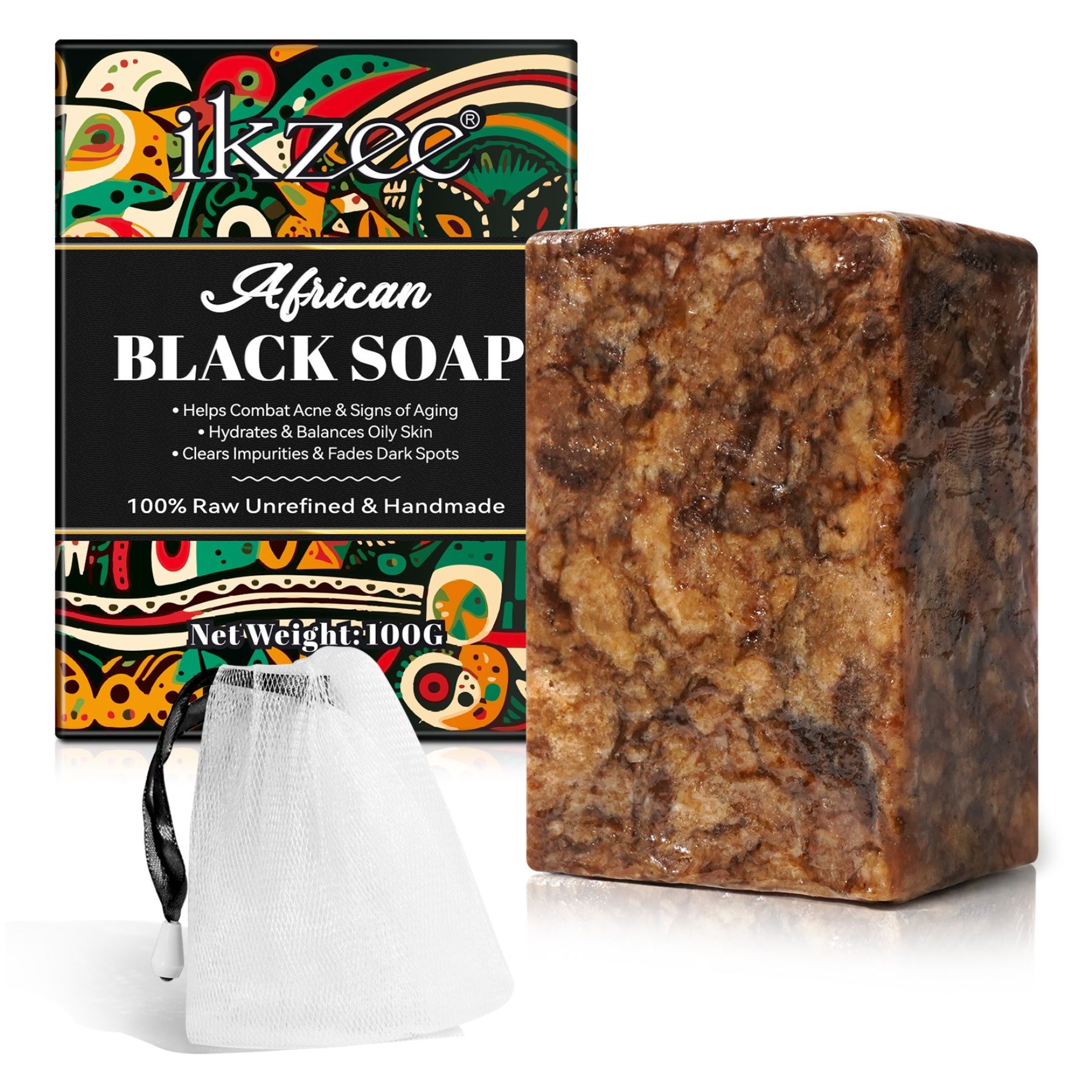 IKZEE Sapone Nero Africano 100 % Naturale – Fatto a mano, Vegano – Contro brufoli, punti neri e impurità – Per viso e corpo – Con sacchetto a rete per creare schiuma.