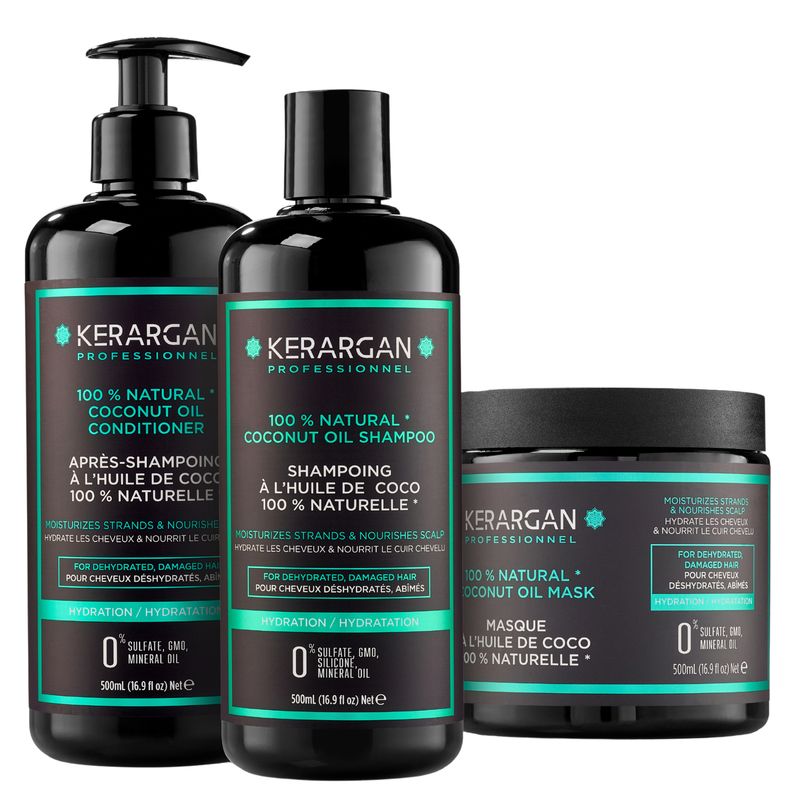 Kerargan - Trio Shampoo, Balsamo & Maschera Olio di Cocco - Capelli Disidratati - Senza solfati, OGM