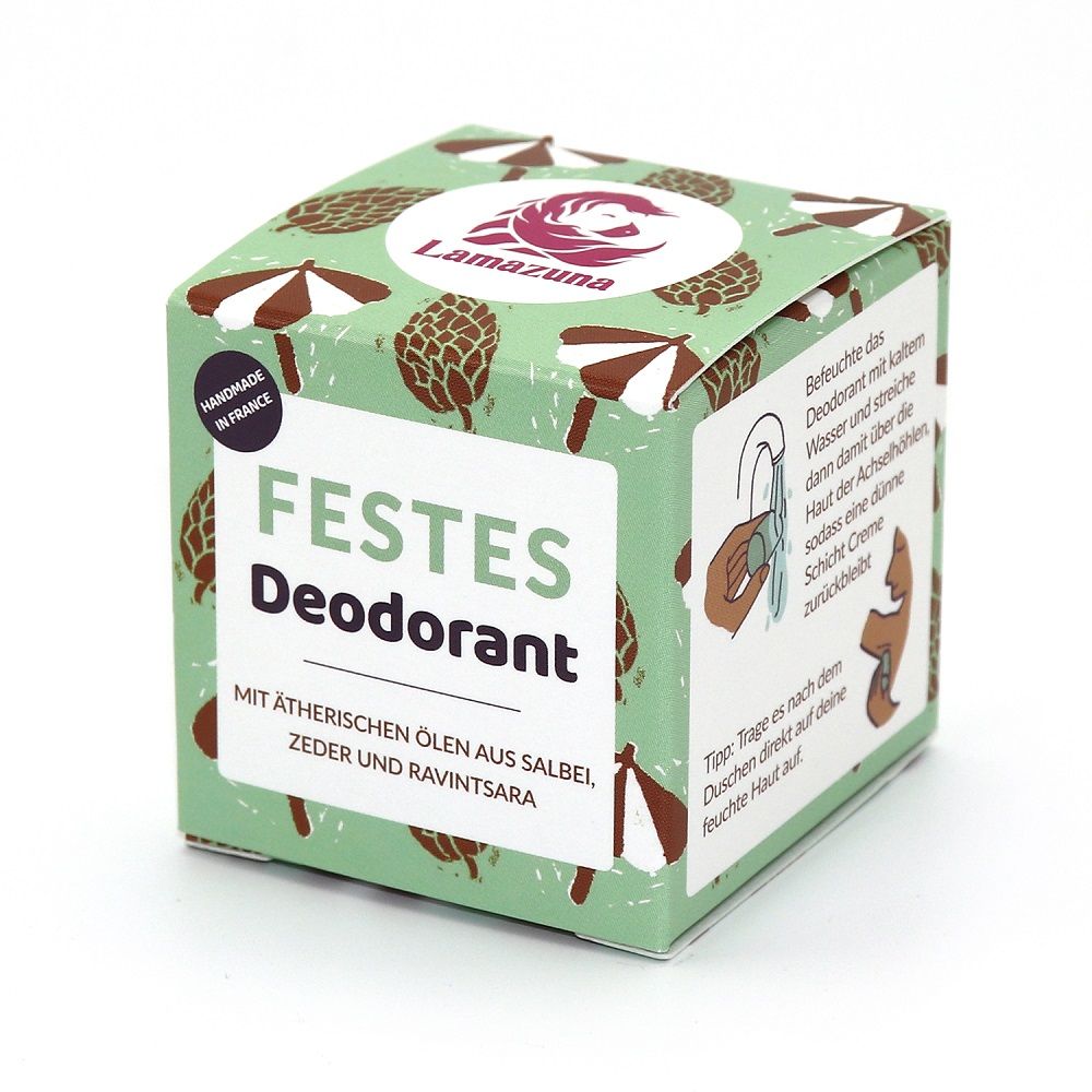 Il deodorante solido di Lamazuna è vegano e privo di alluminio e plastica. Poiché contiene oli essenziali, non è adatto alle donne in gravidanza o in allattamento. Il deodorante può essere utilizzato su tutti i tipi di pelle. Gli oli essenziali di salvia, cedro e ravitsara hanno eccellenti proprietà antibatteriche, antisettiche e antimicrobiche. Inoltre, l'argilla verde ha un effetto assorbente, l'olio di cocco nutre la pelle e il bicarbonato di sodio la deodora.