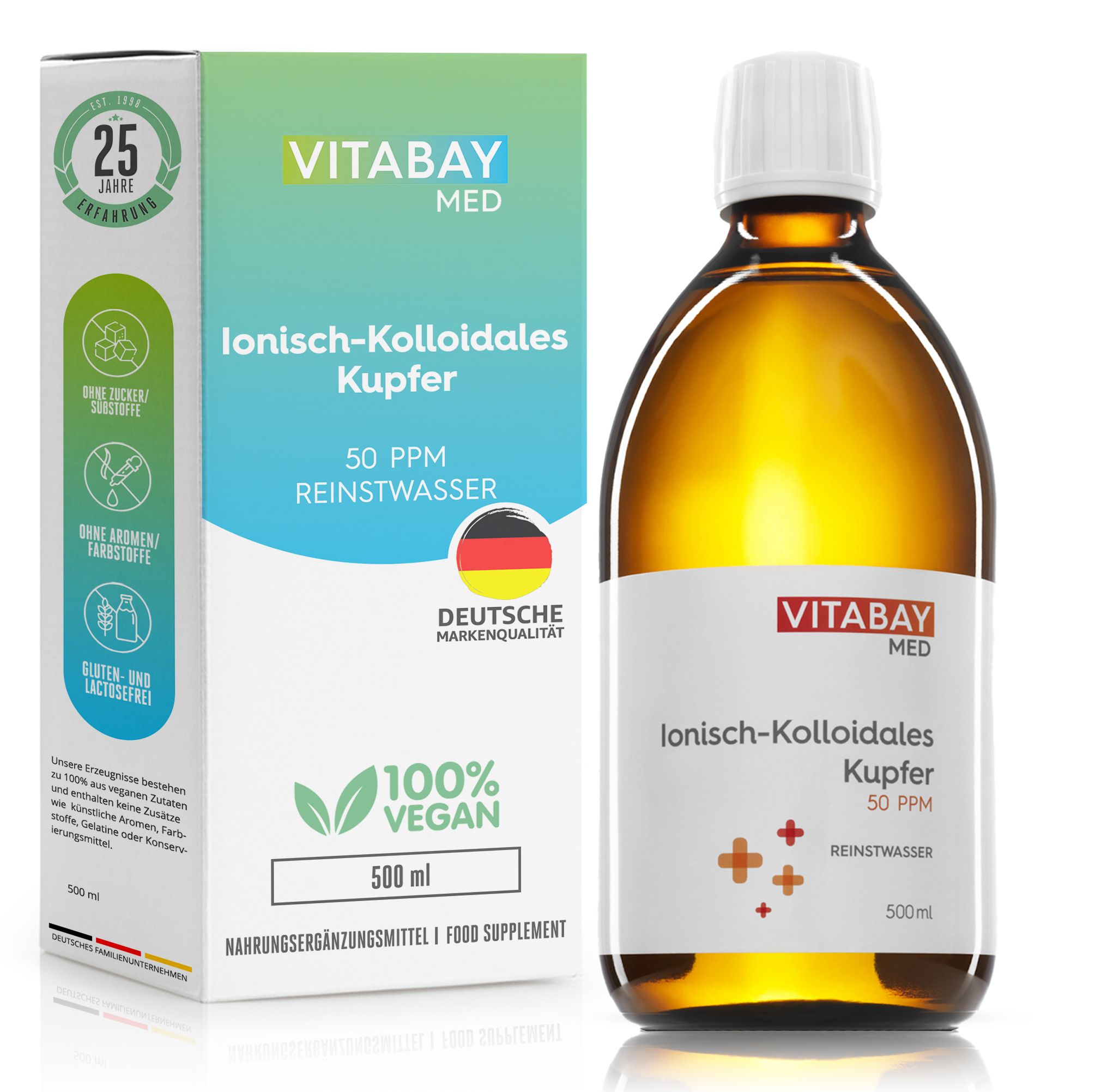 Il Rame colloidale di Vitabay ®MED è altamente concentrato (50 PPM) e ha un livello di purezza del 99,99%. La soluzione è inoltre colloidale al 4% e ionica al 96%. Il rame è un oligoelemento essenziale per il corpo umano. È coinvolto nella funzione di almeno 16 enzimi ed è quindi corresponsabile di numerosi processi.