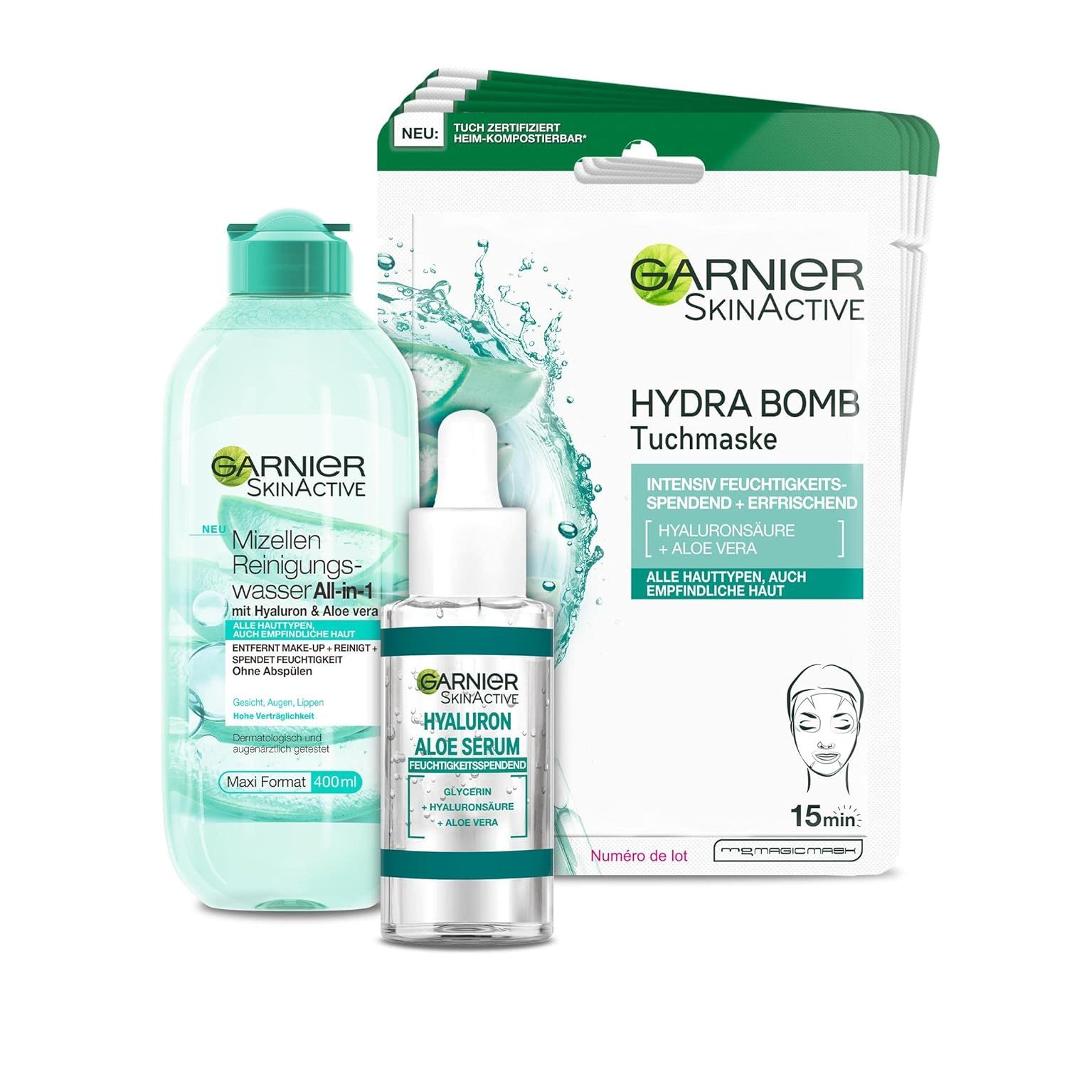 Set per la cura del viso Garnier, con acqua detergente micellare, siero ialuronico all'aloe
