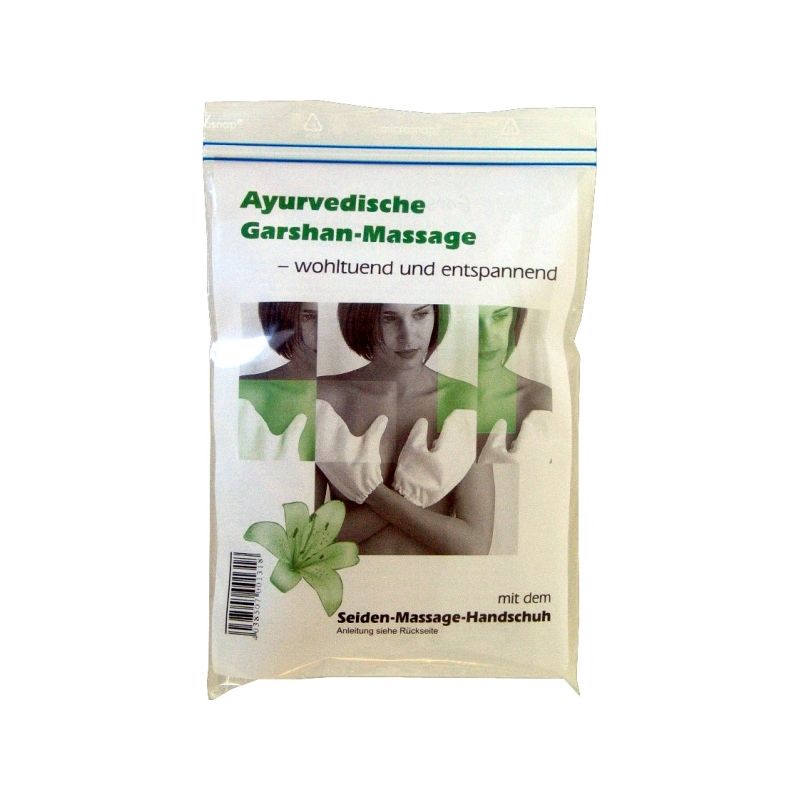 Il massaggio Garshan è particolarmente consigliato durante il digiuno e con aumento del Kapha. Le scorie vengono scomposte dal tessuto. Rimuovendo delicatamente le cellule morte, la pelle diventa particolarmente ricettiva agli oli nutrienti. I guanti sono realizzati a mano e realizzati in seta bourette particolarmente pesante e non sbiancata.