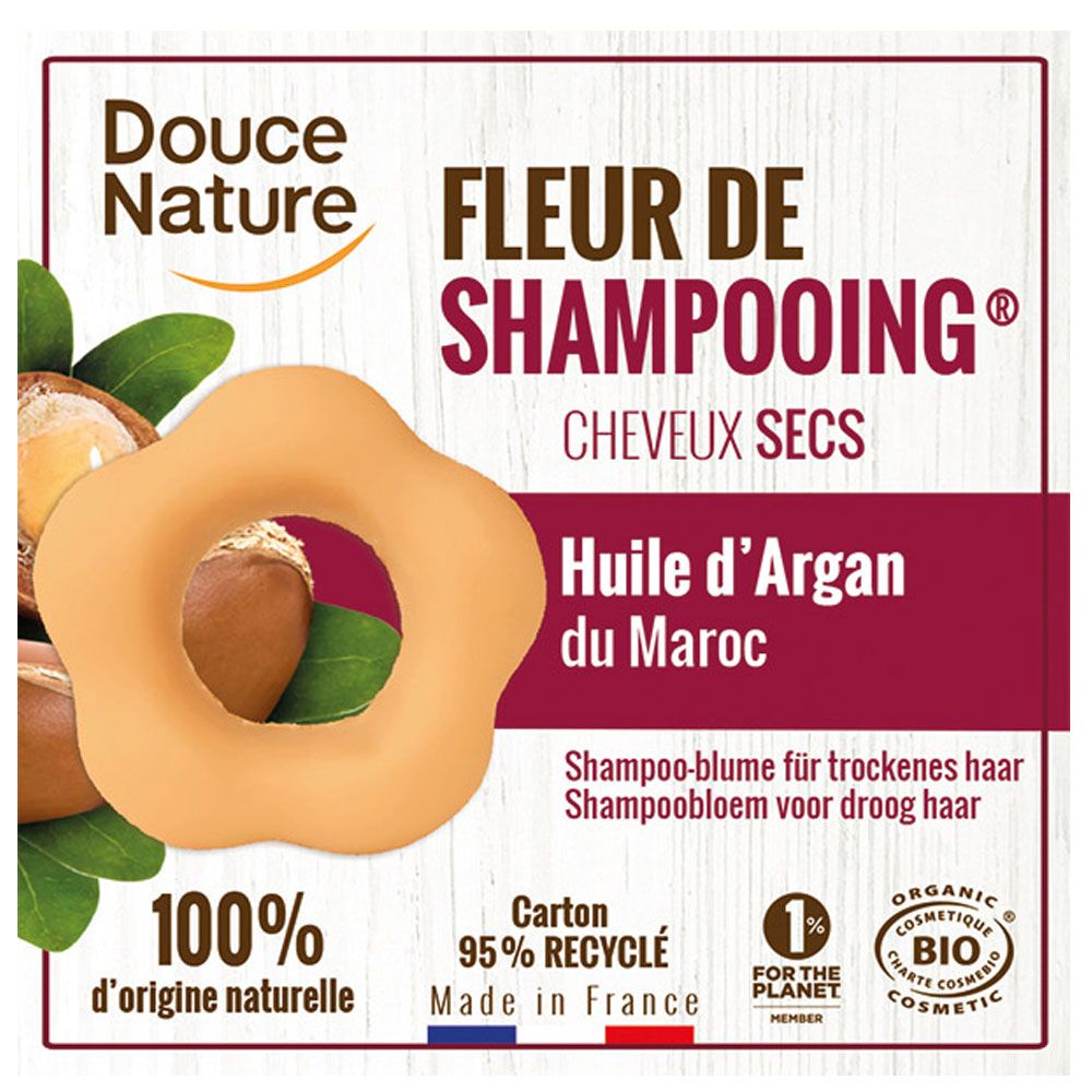 Lo Shampoo Biologico Fiore di Argan Olio di Argan e Argilla Rossa per Capelli Secchi Douce Nature è un prodotto solido. Grazie alla sua schiuma fine, lo shampoo fiore è destinato al lavaggio quotidiano dei capelli. Lo shampoo fiore all'argan BIOLOGICO nutre, ripara e rende lucenti i capelli. L'argilla rossa del fiore dello shampoo è ideale per la pelle secca, protegge il cuoio capelluto. Il burro di karitè del fiore dello shampoo nutre i capelli e li rende elastici e morbidi. Le sostanze medicinali contenute nel fiore dello shampoo sono di origine vegetale. Un fantastico concetto ecologico Tutti i principi attivi di uno shampoo sono combinati su una base di argilla in una forma di fiore attraente e pratica. Niente bottiglia di plastica, niente acqua, meno trasporti, nasce il primo eco-shampoo! Applicazione Bagnare i capelli e fare lo shampoo, strofinare il prodotto sui capelli bagnati, applicare lo shampoo, risciacquare bene. Contenuto Disodium Lauryl Sulfosuccinate, alcool cetearilico, amido di triticum vulgare (grano)*, glicerina**, cocamidopropil betaina, olio di ricino idrogenato, acido stearico, glucoside di cocco, burro di butyrospermum Parkii (karitè)*, acqua, olio di nocciolo di Argania Spinosa *, Bentonite, Parfum (profumo), Illite, Limonene, Linalool, Geraniol. * coltivato biologicamente ** da contenuto biologico