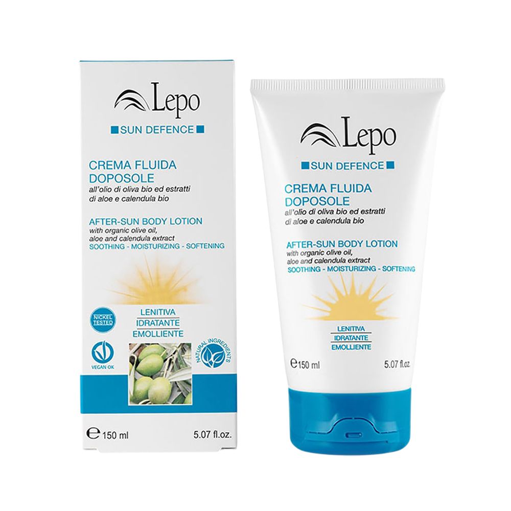 LEPO Crema doposole lenitiva e idratante con olio di oliva bio, aloe e calendula, ideale per pelle dopo il sole.