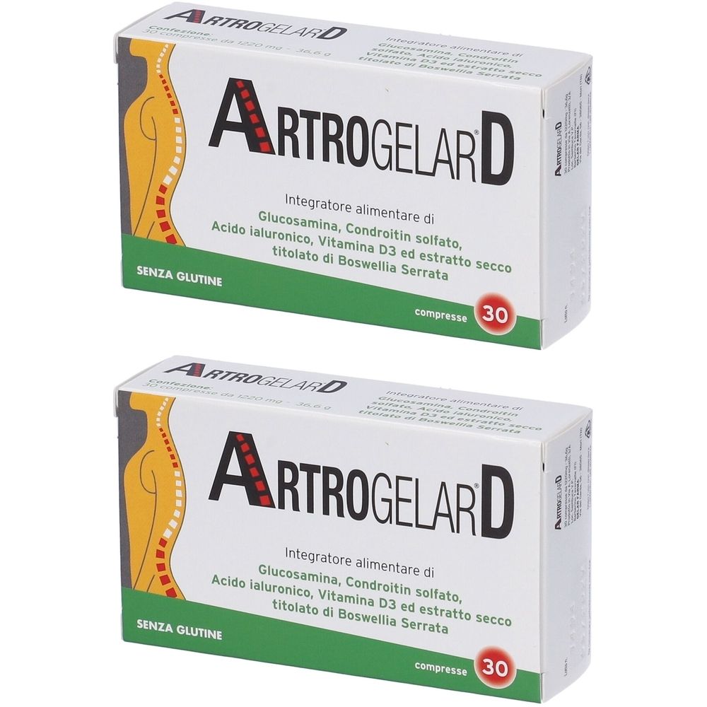 ArtrogelarD è un integratore alimentare a base di Glucosamina, Condroitin solfato, Acido ialuronico, Vitamina D3 ed Estratto secco titolato di Boswellia. La Boswellia è utile per la funzionalità articolare. La Vitamina D3 contribuisce al mantenimento di ossa normali e a normali livelli di calcio nel sangue.