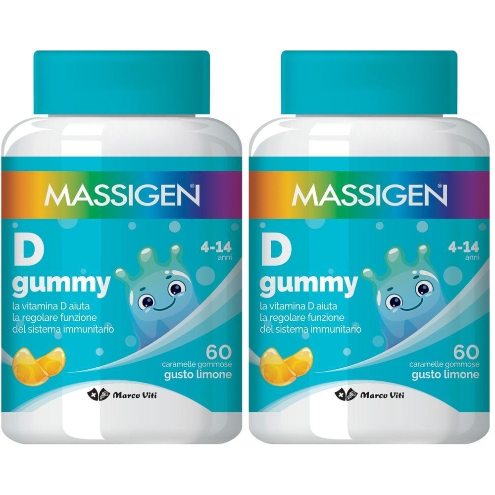 MASSIGEN D GUMMYè un integratore alimentare per bambini dai 4 ai 14 anni. Gradevole gusto limone.La vitamina D aiuta il regolare funzionamento del sistema immunitario, contribuisce al mantenimento della funzione muscolare, nonché al mantenimento di ossa e denti sani.