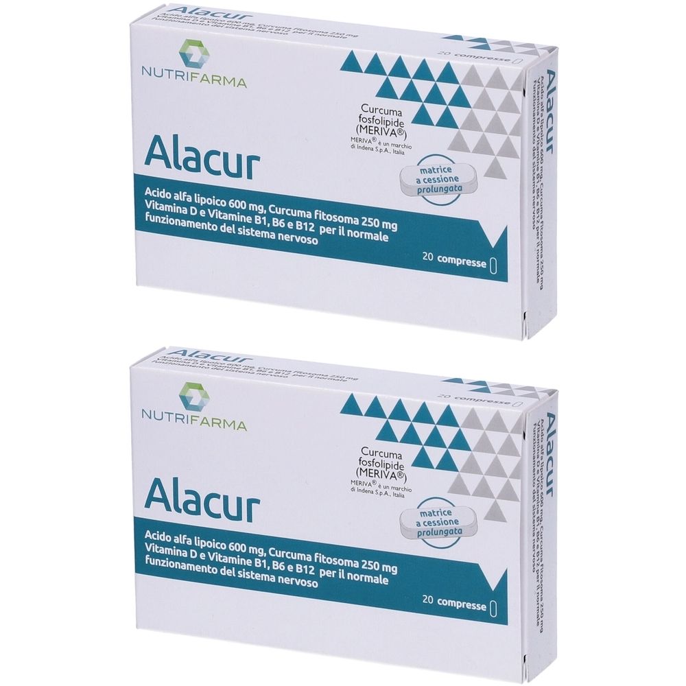Acido alfa lipoico, curcuma Meriva fitosoma [curcuminoidi da rizoma di curcuma (Curcuma longa L.); agente di carica: cellulosa; emulsionante: lecitina di soia]; agenti di carica: cellulosa, fosfato dicalcico; agenti antiagglomeranti: talco, biossido di silicio, sali di magnesio degli acidi grassi; colecalciferolo (vitamina D), tiammina cloridrato (vitamina B1), cloridrato di piridossina (vitamina B6), cianocobalamina (vitamina B12); agenti di rivestimento: idrossi-propil-metilcellulosa, carbonato di calcio, talco, glicerolo, ossidi e idrossidi di ferro. Senza glutine e lattosio.