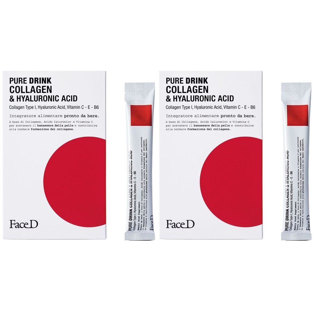 Face D Integratore Pure Drink Collagene e Acido Ialuornico è un integratore alimentare pronto da bere formulato con collagene marino idrolizzato di Tipo I e Acido Ialuronico, con aggiunta di vitamine C, E e B6.