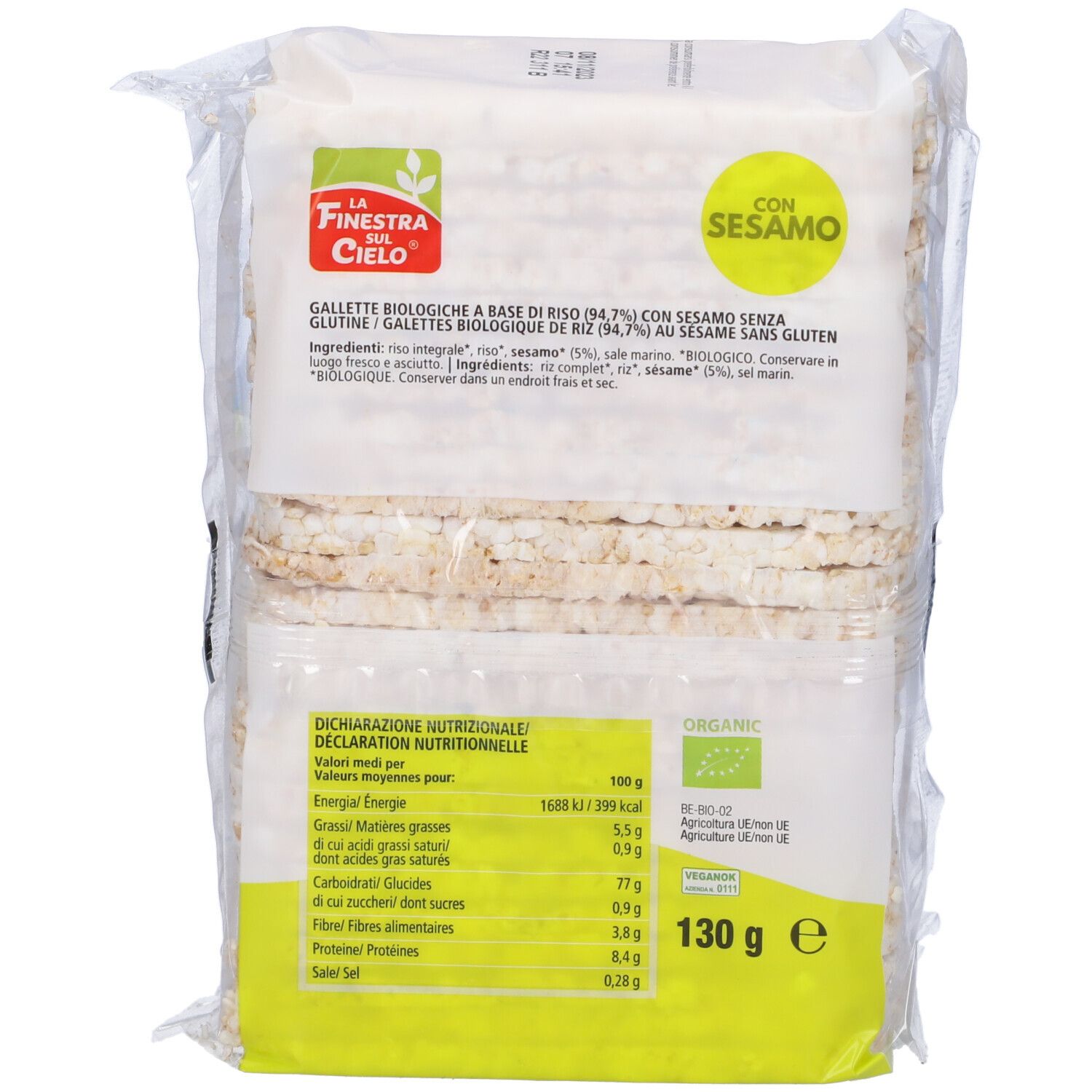 Gallette biologiche di riso al sesamo senza glutine. Ideali come alternativa al pane. Prodotto adatto ai vegani.