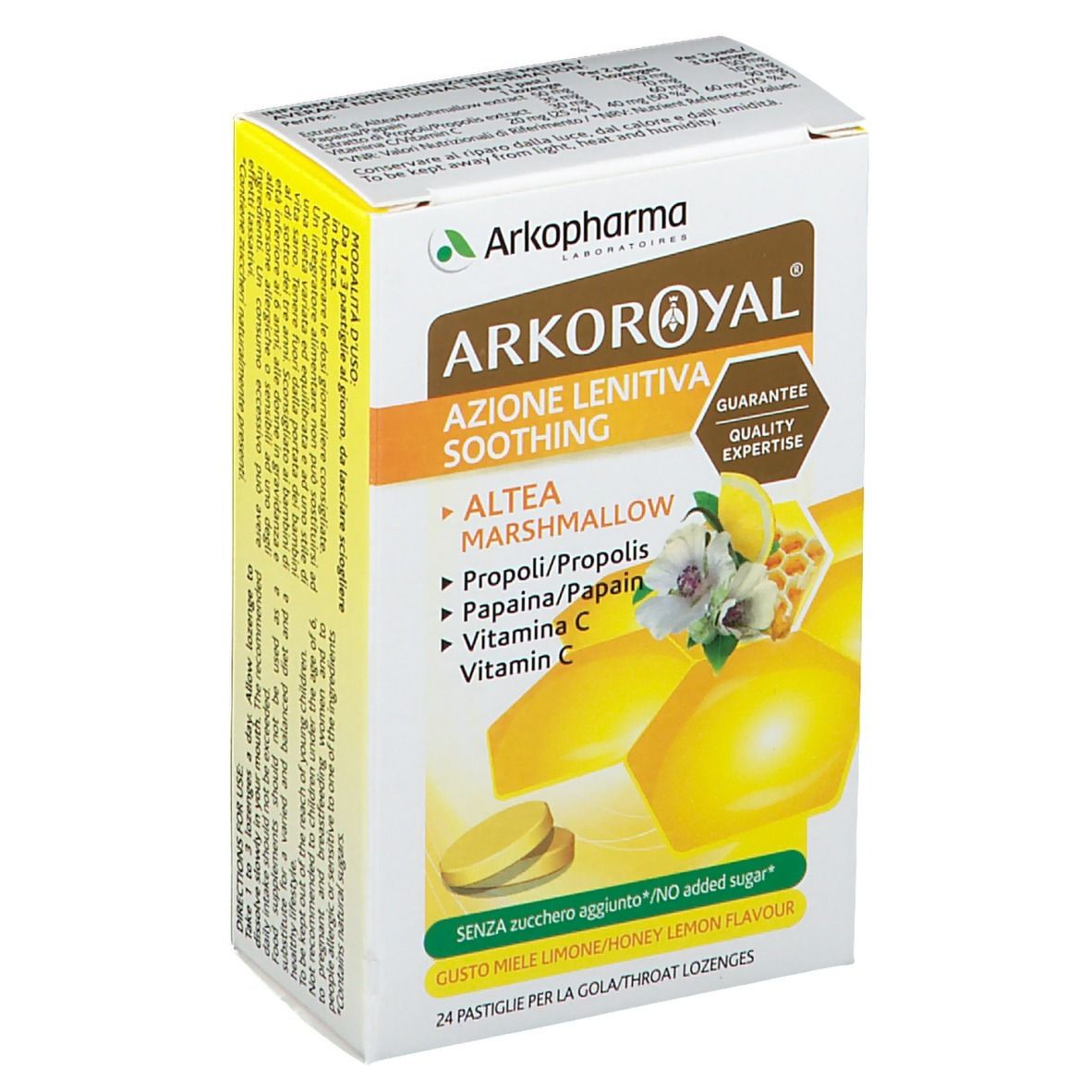 Queste pastiglie al gusto di miele e limone contengono Papaina (enzima naturale estratto dalla Papaia), Vitamina C e Altea. L’Altea è utile per il BENESSERE DELLA GOLA e migliora il funzionamento delle mucose dell’apparato respiratorio. La vitamina C contribuisce alla normale funzione del sistema immunitario.