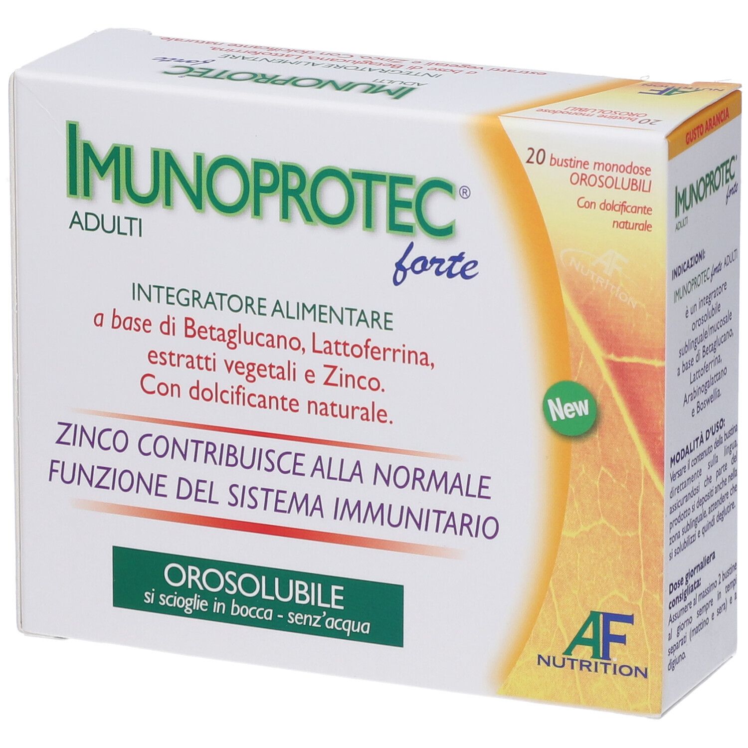 Isomalto; Agente di carica: Maltodestrine; Beta-Glucano 1,3-1,6 da lievito (Saccharomyces cerevisiae) tit. 85%; Lattoferrina 95% (derivato del Latte); Arabinogalattano da corteccia di Larice (Larix occidentalis L.); Boswellia (Boswellia serrata Roxb.) resina gommosa e.s. tit. 65% Ac. Boswellici; Zinco citrato; Acidificante: Acido citrico; Aroma naturale di arancia; Edulcorante: Steviosidi.