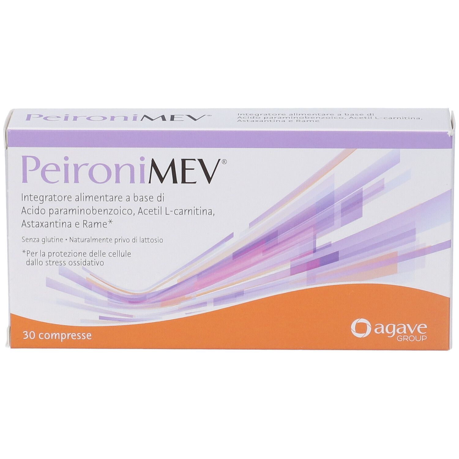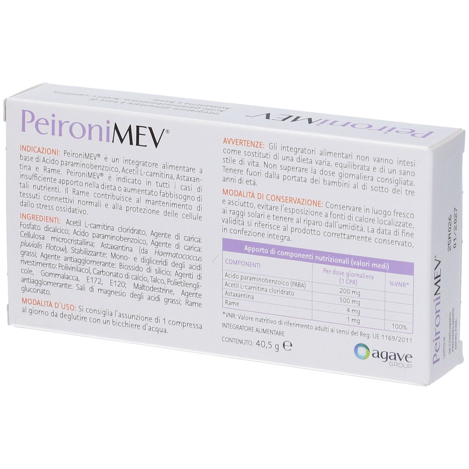 PeironiMEV Descrizione Integratore alimentare a base di acido paraminobenzoico, acetil L-carnitina, astaxantina e rame. PeironiMEV è indicato in tutti i casi di insuffieciente apporto nella dieta o aumentato fabbisogno di tali nutrienti. Il rame contribuisce al mantenimento di tessuti connettivi normali e alla protezione delle cellule dallo stress ossidativo.