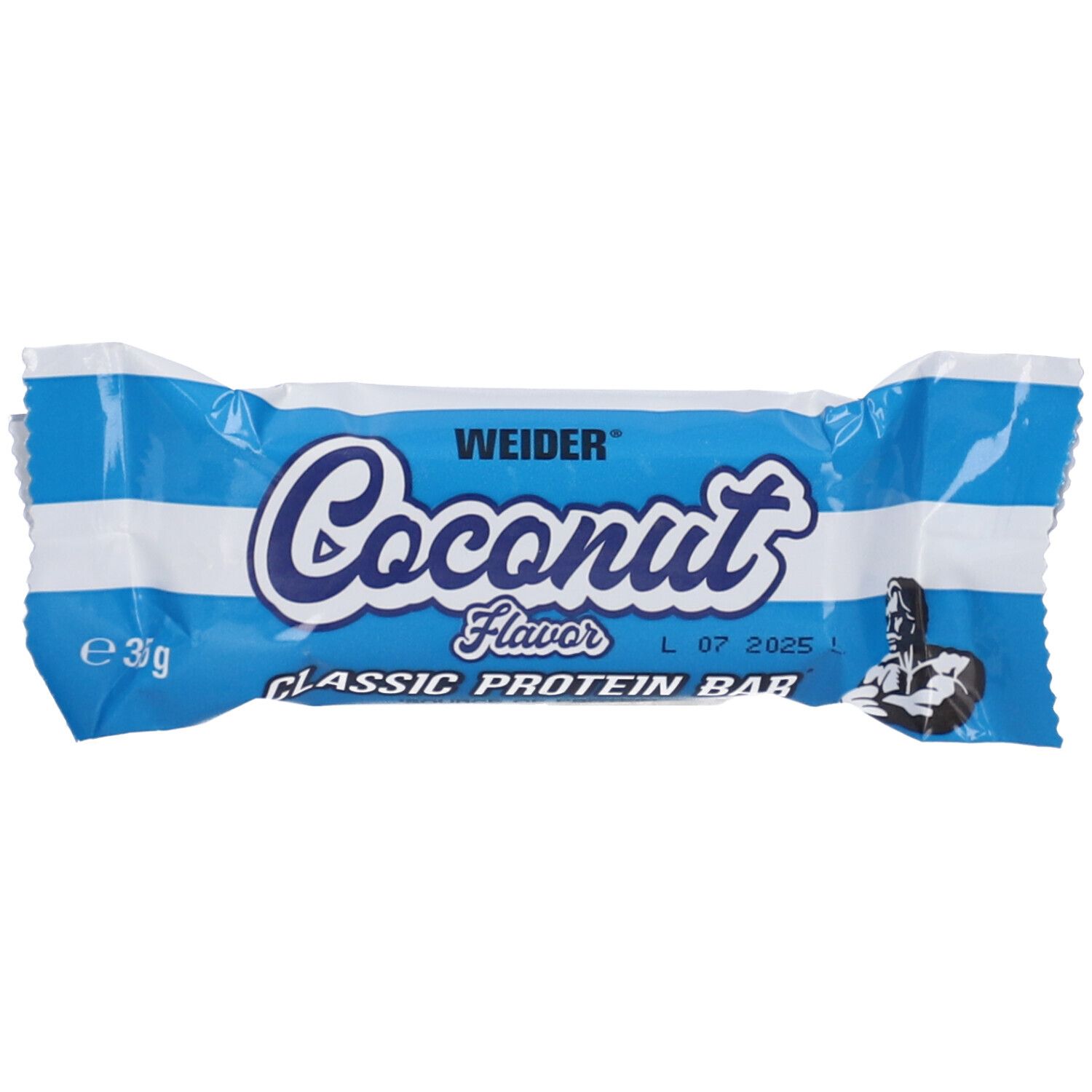 Barretta con carboidrati e proteine ricoperta di cioccolato allatte (23%). Gusto cocco