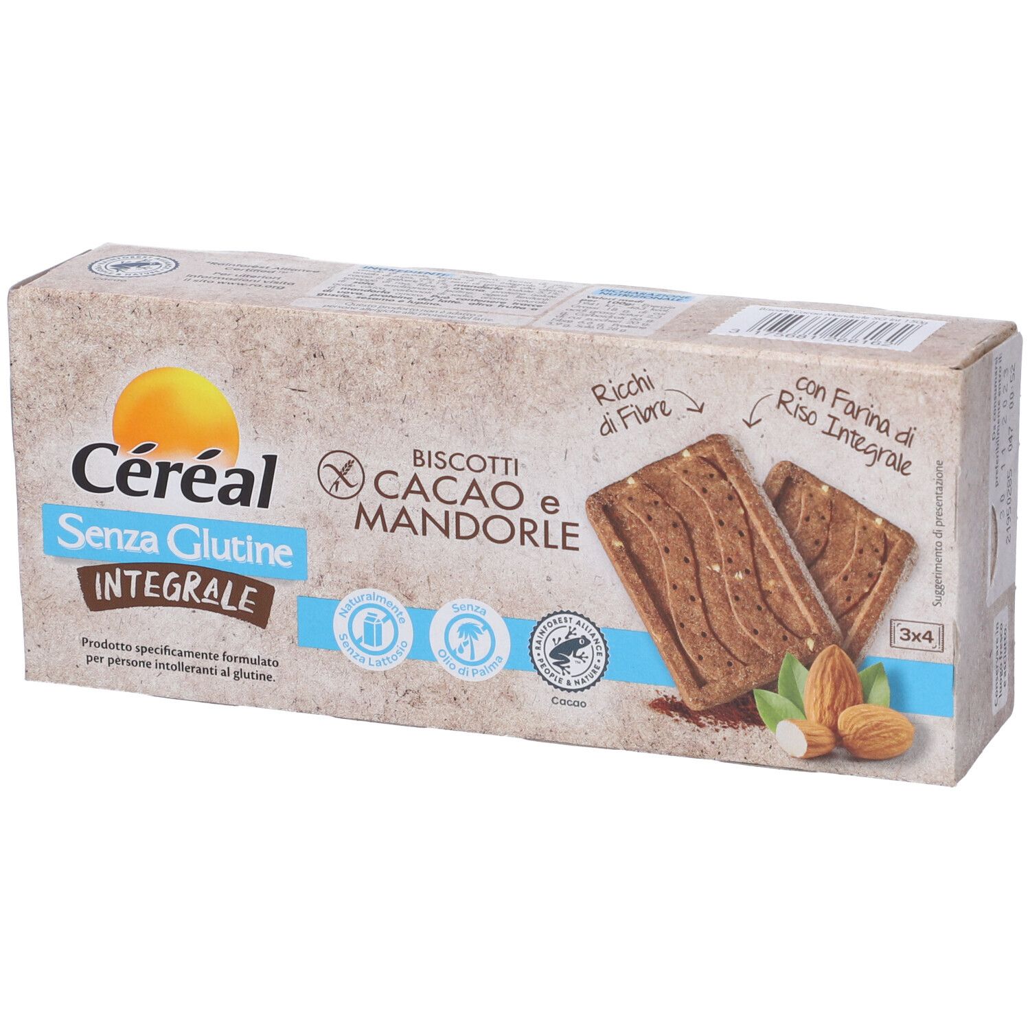 Zucchero, farina di mais, amido di patata, farina di riso integrale 12,7%, amido di mais, olio di semi di girasole alto oleico, cacao in polvere 5,1%, mandorle tostate 5,1%, sciroppo di riso, fibre di avena, proteine isolate di soia, emulsionanti: lecitine; agenti lievitanti: acido citrico, carbonati di sodio, aroma naturale di mandorla amara. Può contenere tracce di uova, proteine del latte, altra frutta a guscio, sesamo e lupino.