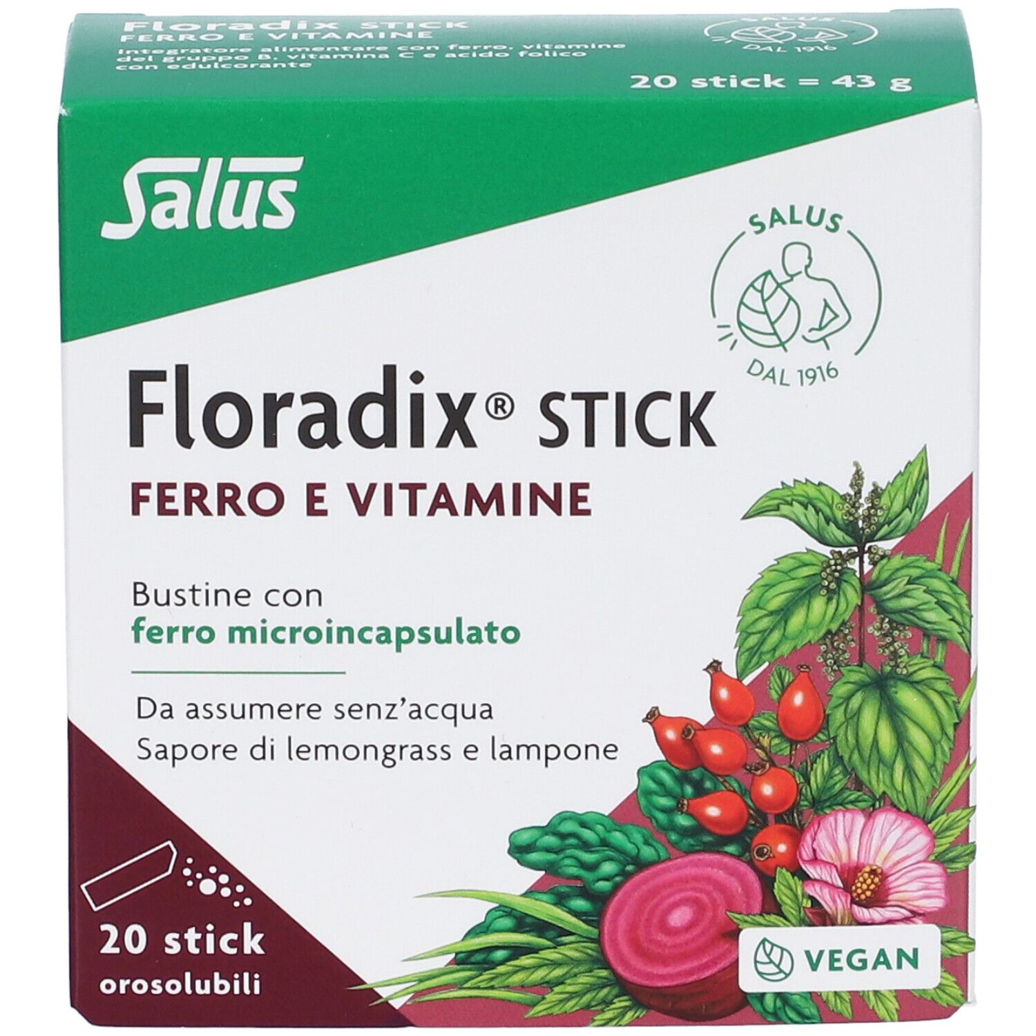 Integratore alimentare. Floradix STICK contiene ferro, vitamine B2, B6, B12, C, niacina e acido folico che contribuiscono alla riduzione della stanchezza e dell’affaticamento. Inoltre, il ferro contribuisce alla normale formazione di globuli rossi e di emoglobina. La vitamina C accresce l’assorbimento del ferro. L’acido folico contribuisce alla normale emopoiesi e alla crescita dei tessuti materni in gravidanza. Floradix STICK ha un piacevole sapore di lemongrass e lampone e consente una rapida assunzione di ferro e vitamine senza bisogno di acqua. Floradix STICK è particolarmente indicato per donne, anche in gravidanza e in allattamento, adolescenti, anziani, vegetariani, vegani e per chi segue uno stile di vita attivo.