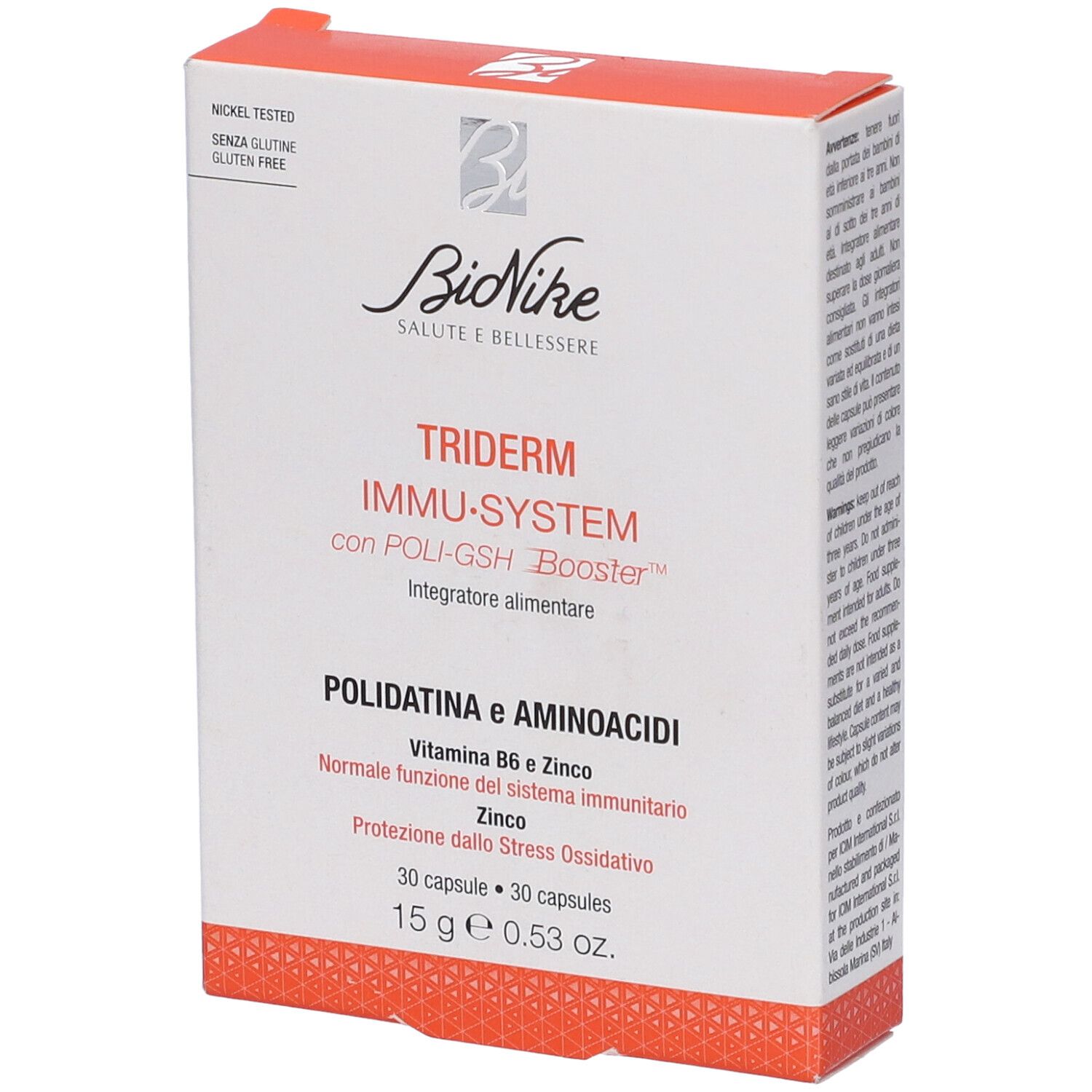 Integratore alimentare con POLI-GSH BOOSTER, costituito da polidatina e dai precursori del glutatione (GSH), aminoacidi glicina e glutammina e da N-acetilcisteina. Con vitamina B6 e zinco che contribuiscono alla normale funzione del sistema immunitario. Lo zinco inoltre contribuisce alla protezione delle cellule dallo stress ossidativo.
