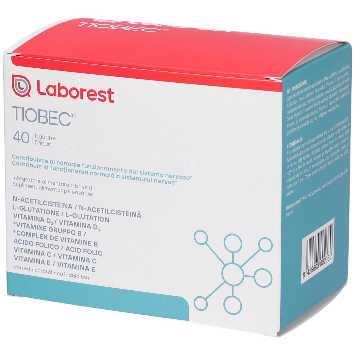 Tiobec® è un integratore a base di N-Acetilcisteina, L-Glutatione, Vitamina D3, Vitamine del gruppo B, Vitamina E e Vitamina C, utile in caso di aumentato fabbisogno di queste sostanze. Tiobec® è indicato in caso di aumentato fabbisogno di queste sostanze e favorisce la protezione delle cellule dallo stress ossidativo. Tiobec® può essere utilizzato sia durante sia successivamente ad una terapia con farmaci antidolorifici e/o antinfiammatori.