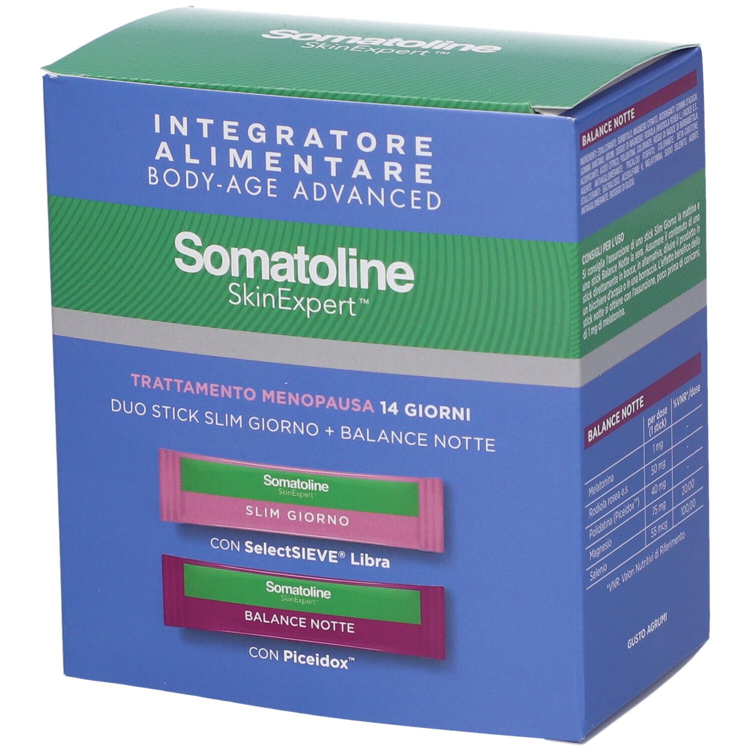 Slim giorno: integratore alimentare a base di: - Moringa oleifera per il metabolismo dei lipidi e l'equilibrio del peso corporeo; - gelso bianco favorisce il metabolismo dei carboidrati; - Rhodiola rosea tonico naturale contro la stanchezza fisica e mentale; - salvia contro i disturbi della menopausa; - vitamina B6 contribuisce alla regolazione dell'attività ormonale. Con SelectSIEVE Libra. Balance notte: integratore alimentare a base di: - selenio contribuisce alla portezione delle cellule dallo stress ossidativo; - Rhodiola rosea tonico adattogeno; - melatonina contribuisce alla riduzione del tempo di addormentamento; - magnesio contribuisce alla riduzione della stanchezza fisica e mentale. Con polidatina Piceidox.