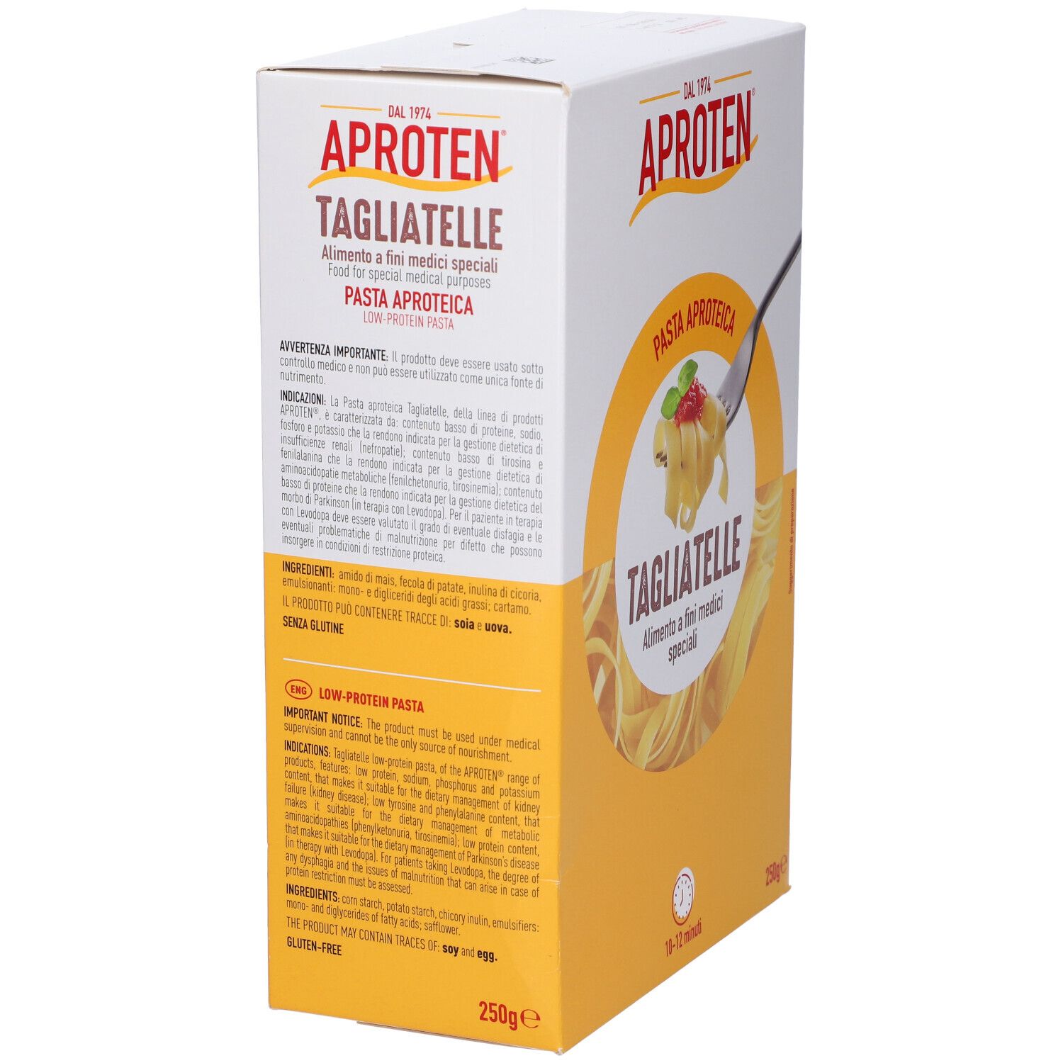 La Pasta aproteica della linea di prodotti APROTEN, è caratterizzata da: contenuto basso di proteine, sodio, fosforo e potassio che la rendono indicata per la gestione dietetica di insufficienze renali (nefropatie); contenuto basso di tirosina e fenilalanina che la rendono indicata per la gestione dietetica di aminoacidopatie metaboliche (fenilchetonuria, tirosinemia); contenuto basso di proteine che la rendono indicata per la gestione dietetica del morbo di Parkinson (in terapia con Levodopa). Per il paziente in terapia con Levodopa deve essere valutato il grado di eventuale disfagia e le eventuali problematiche di malnutrizione per difetto che possono insorgere in condizioni di restrizione proteica.