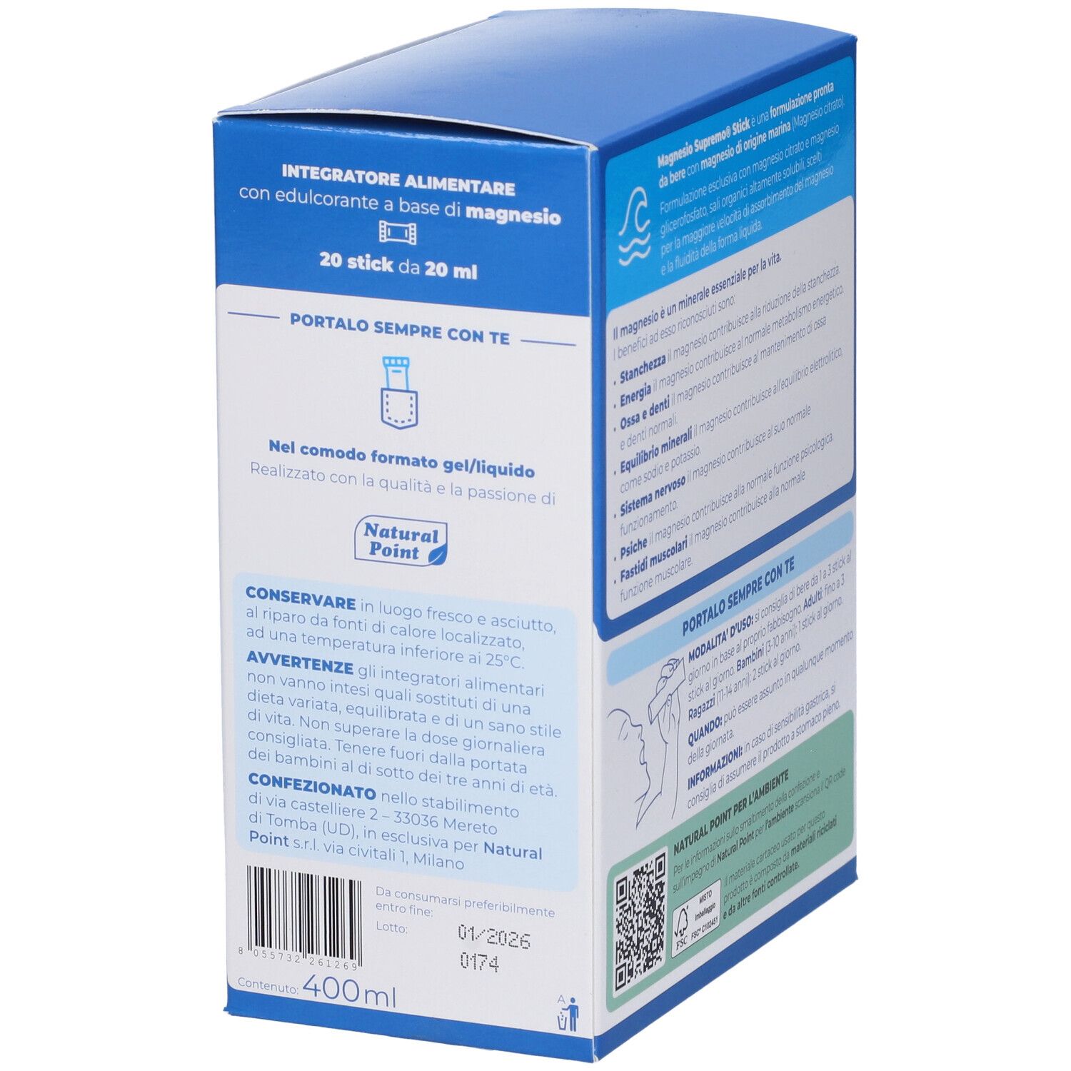 Formulazione pronta da bere con magnesio di origine marina (magnesio citrato). Formulazione esclusiva con magnesio citrato e magnesio glicerofosfato, sali organici altamente solubili, scelti per la maggiore velocità di assorbimento del magnesio e la fluidità della forma liquida.